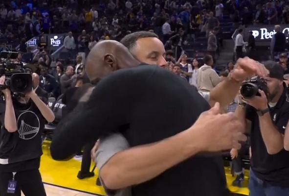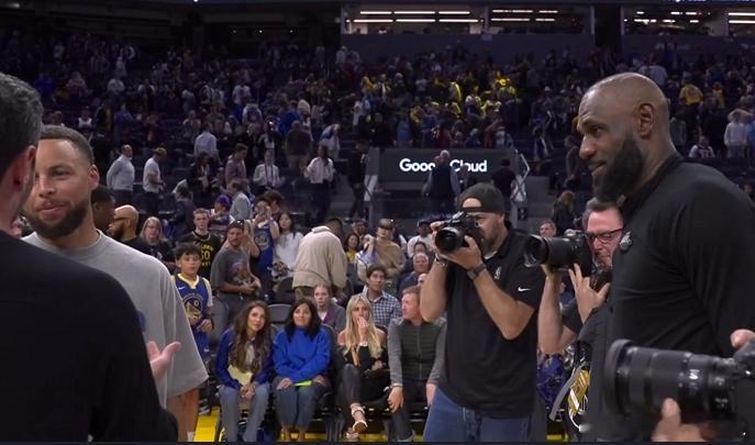 詹姆斯和库里拥抱詹姆斯等库里唠完嗑 NBA焦点战,湖人大胜勇士,赛后詹姆斯和库里