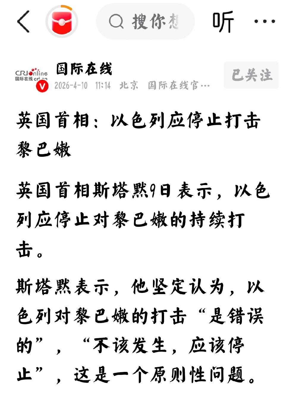 2026年4月10日,国际在线发布两条新闻:一是以色列总理内塔尼亚胡布,宣称:“不会在黎巴嫩停火”;二是4月9日英国首相斯塔默表示:“以色列应该停止打击黎巴嫩”。