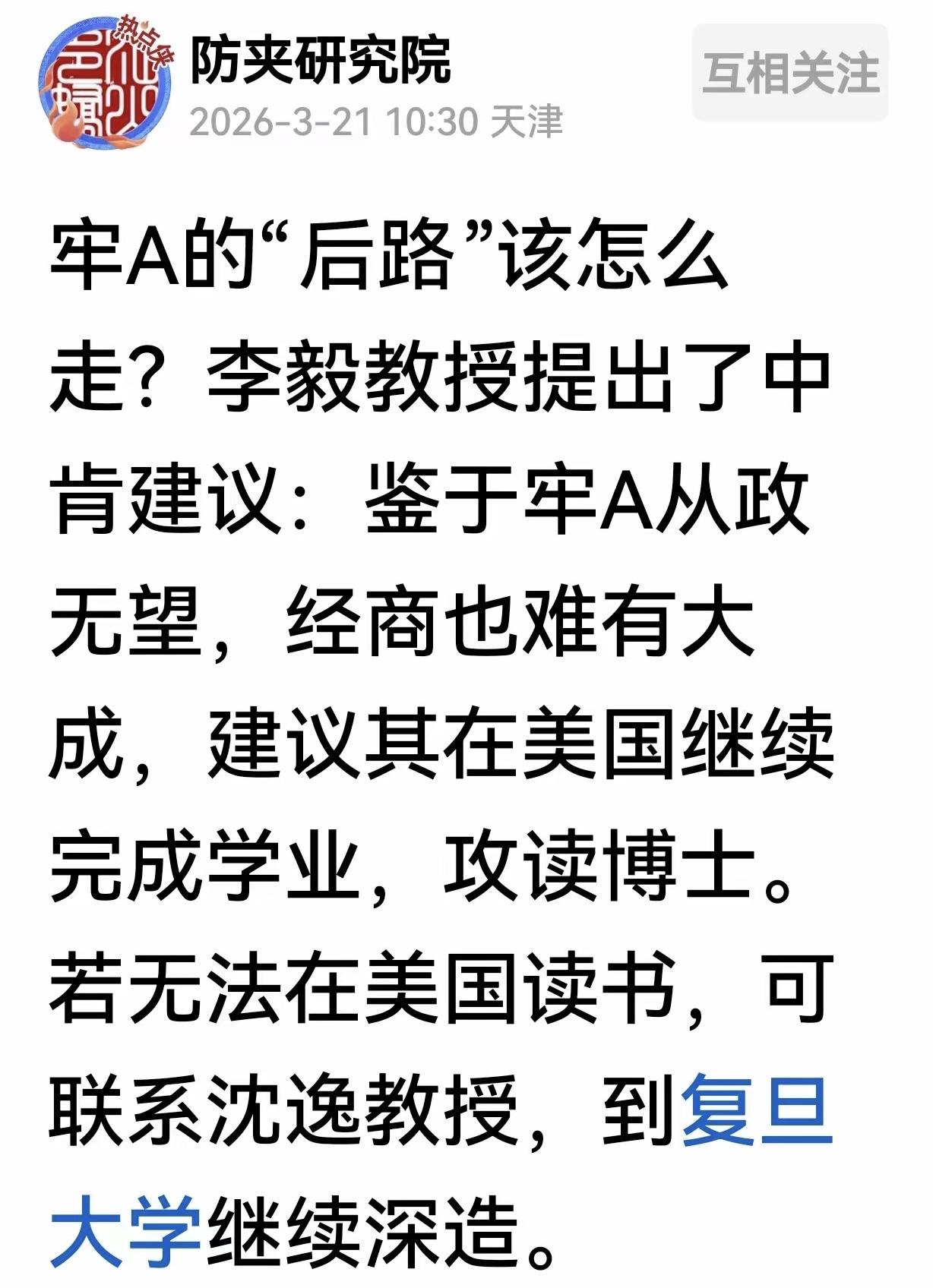抛开观点不说,牢A确实是个成功人士,短短几个月,就爆红成为华人圈最有成就的人物,不但学术名词震耳欲聋,个人名望全国第一,而且,得到了最主要官媒的首肯。不要说沈逸比不了,张维为、高志凯也不行,现在,无论社会,还是媒体,还是网络,还是主流都躺开了一条光明大道,从政有政治基础,做学术有现成的科研成果,经济上已经收入颇丰。这个,不能不服!收割智商税,认知税,也都是心甘情愿,就是这样。