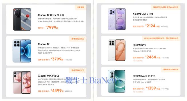 手机品类汇聚Xiaomi与REDMI双品牌核心机型,Xiaomi17Ultra徕卡版采用经典双拼材质,到手价7999元起;Xiaomi17、XiaomiMIXFlip2可享国补至高500元。REDMI系列中,搭载骁龙8至尊版的REDMIK90,12+512GB及以上版本国补后仅2464.15元起;REDMINote15Pro,12+256GB及以上版本国补后1359.15元起,兼顾性能与性价比。