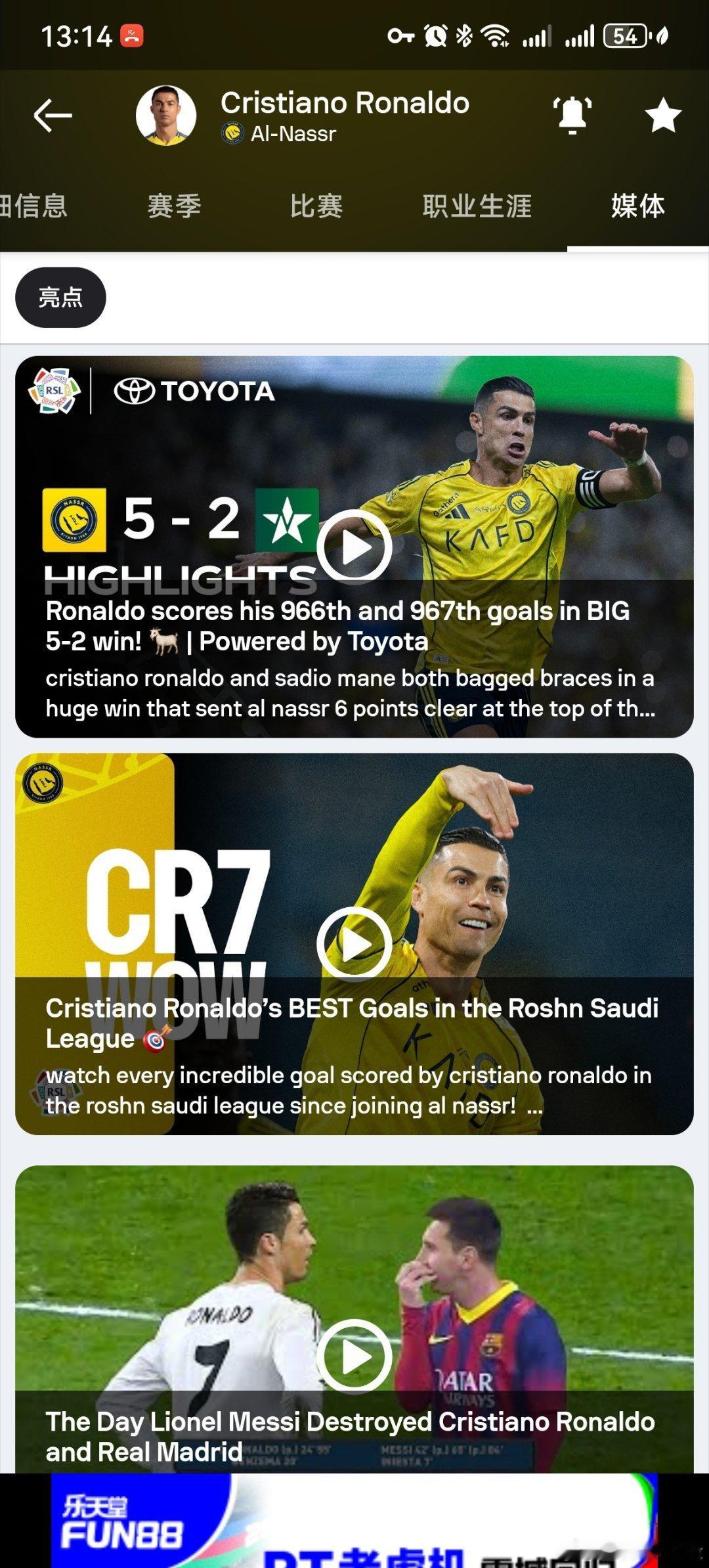 首先,Sofascore 上这个就很离谱,Sofascore 没有显示 C 罗的总进球,只是统计 C 罗各个赛季的数据,那些说 Sofascore 把 C 罗进球从 967 调整为 961 的没有一个可以拿得上图的。其次,Sofascore 确实剔除了 23-24 赛季 C 罗荣誉和数据栏里阿拉冠的数据。但是离谱的来了,Sofascore 又在 C 罗媒体新闻那一栏说明了 C 罗在对阵纳杰马的比赛中打进了 966 和 967 粒进球。