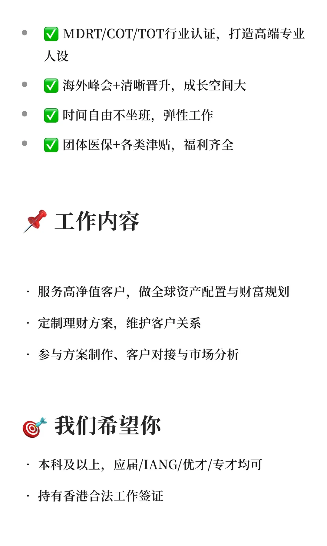 📍铜锣湾优质团队提供高佣金、1.5w-5w月津贴、证书赞助等福利,工作自由、晋升清晰。负责全球资产配置,服务高净值客户,本科及以上学历,持有香港签证,沟通能力强者优先。
