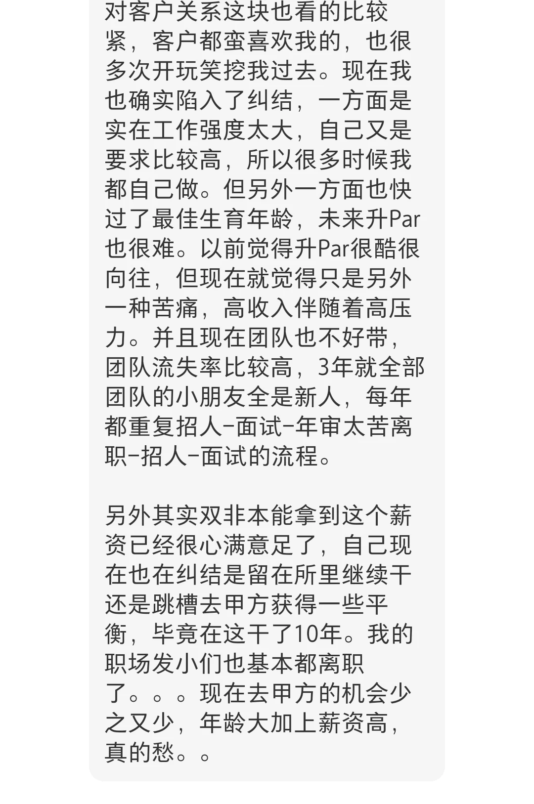 双非本10年,33岁,现在四大高级经理2,女生,去年是top绩效的,年薪有75w,但真的很累很累,我属于比较亲力亲为的SM,基本报告都自己抓,对客户关系这块也看的比较紧,客户都蛮喜欢我的,也很多次开玩笑挖我过去。现在我也确实陷入了纠结,一方面是实在工作强度太大,自己又是要求比较高,所以很多时候我都自己做。但另外一方面也快过了最佳生育年龄,未来升Par也很难。以前觉得升Par很酷很向往,但现在就觉得只是另外一种苦痛,高收入伴随着高压力。并且现在团队也不好带,团队流失率比较高,3年就全部团队的小朋友全是新人,每年都重复招人-面试-年审太苦离职-招人-面试的流程。