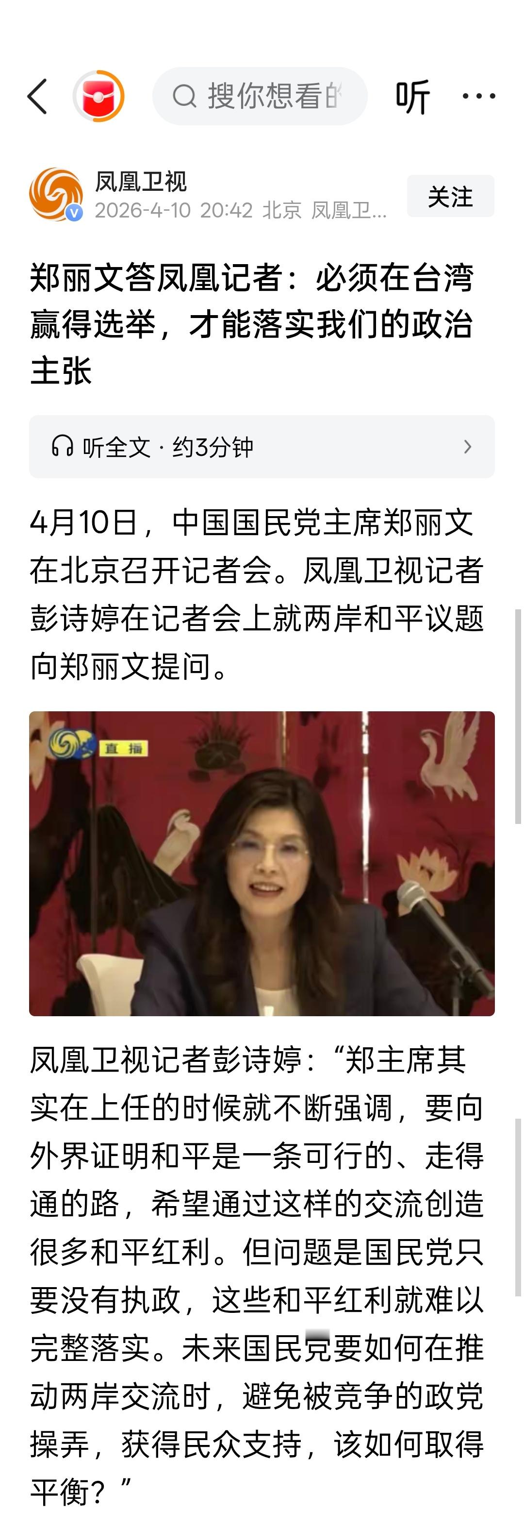 郑丽文答凤凰记者:必须在台湾赢得选举,才能落实我们的政治主张