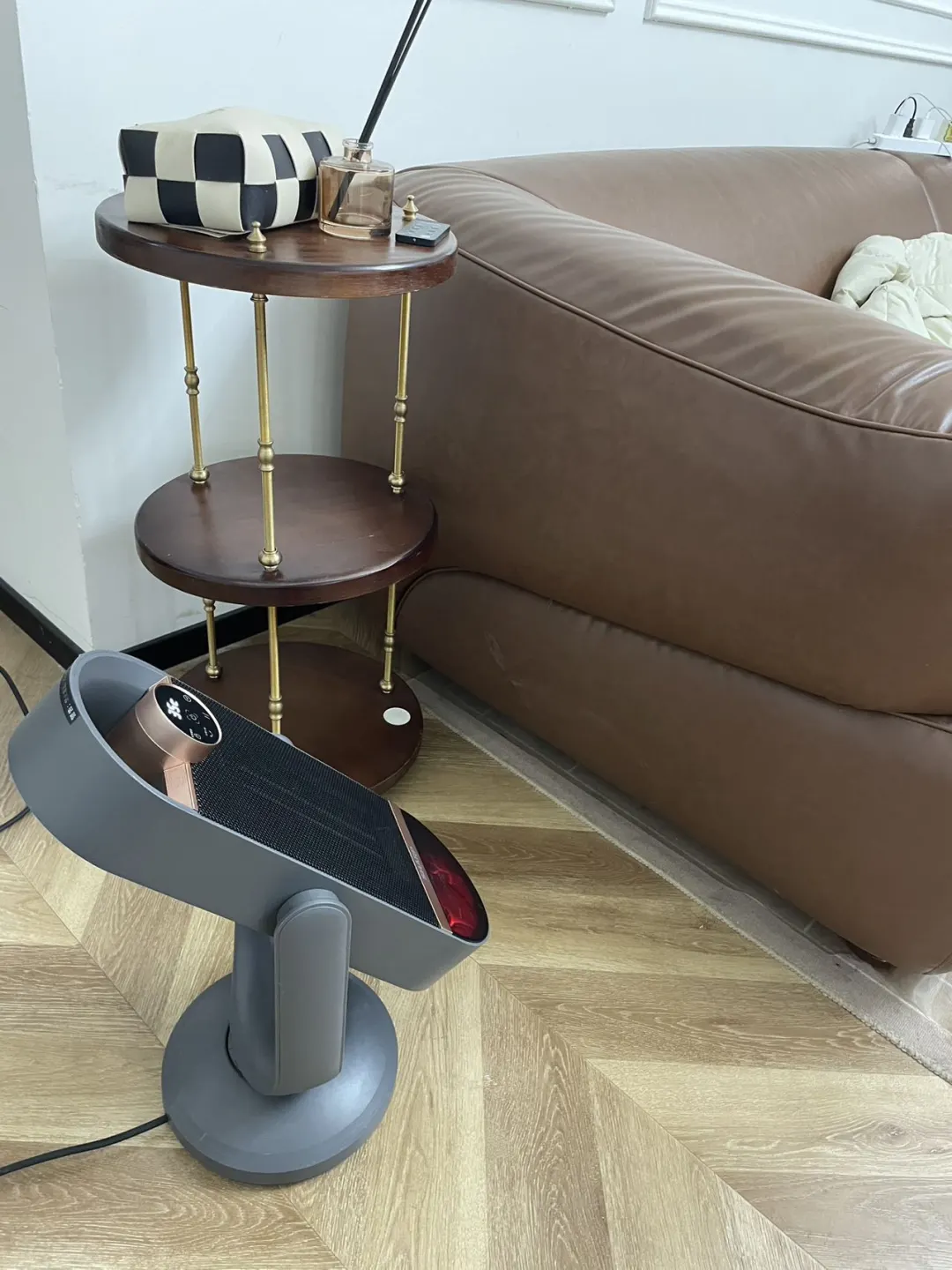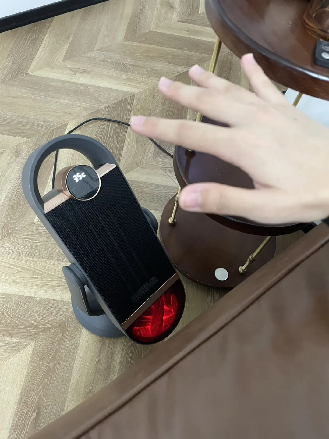 后来看到朋友用了一款可以调整机身角度的,抱着试试的心态买回来,结果有被满足到。我就用上下调整把机身往上仰一点,暖风就能顺着角度向上直吹散开,我手搭在沙发旁边正正好能吹到,再也不用把胳膊往下垂着去找平行吹出来的风。而且风力是带着温润感的柔风,哪怕连续开一整天,周围空气也不会变得干巴巴的。在客厅打个游戏,看会书,手也不会冰凉,一直开着整体室温也能带起来。