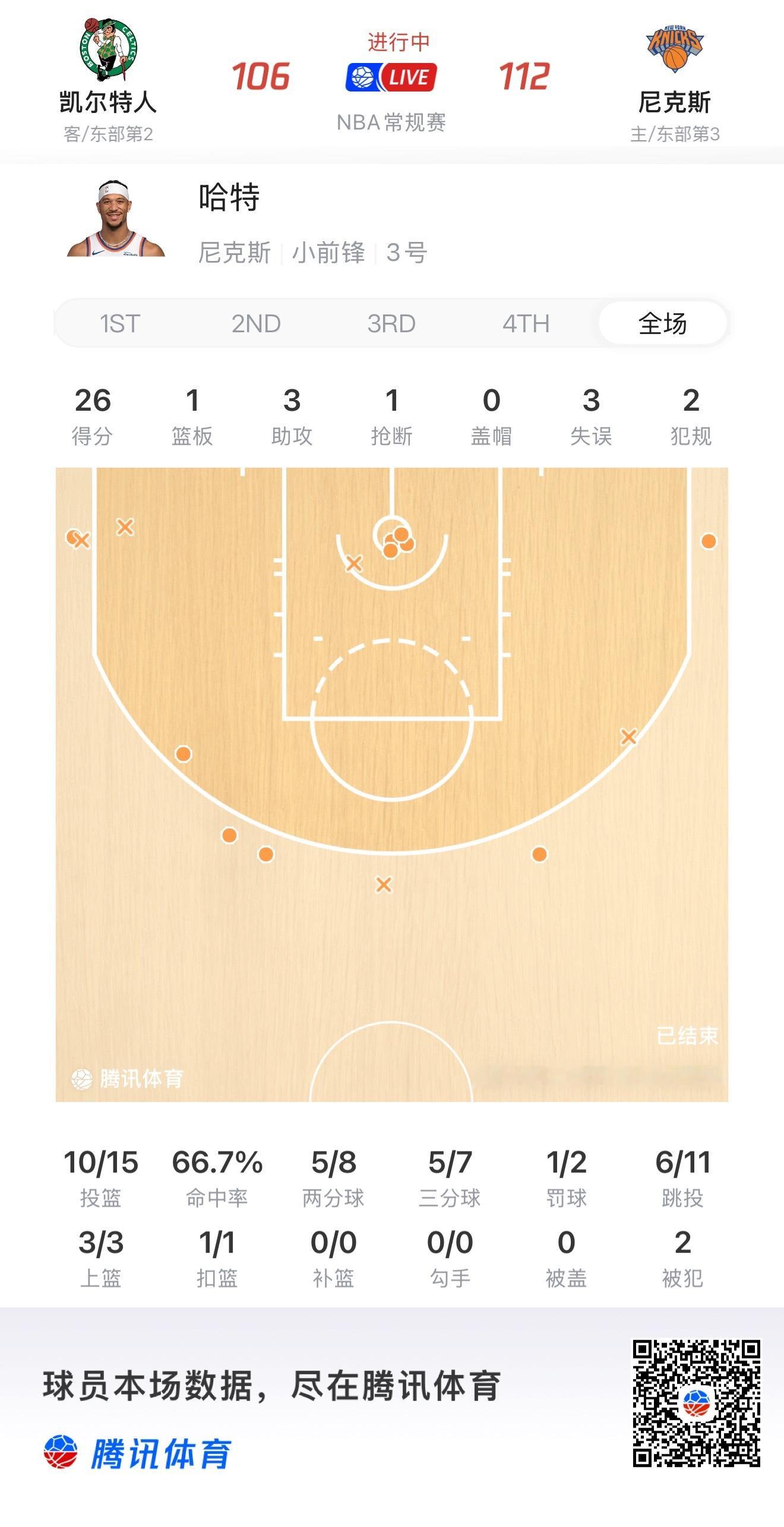 没有杰伦·布朗、塔图姆+怀特32中9,哈特投进5记三分惩罚错防,场面上能打成这样对凯尔特人来说已经不错了,尤其是沙伊尔曼投进6记三分、得到20分,塔图姆和武切维奇打出一些化学反应、武切维奇终于投进了三分。伤后塔图姆的启动爆发力有明显下滑,今天面对布伦森的防守多次被逼停、合计5中0。可以预见的是,两队如果顺利在季后赛次轮相遇,又将是一轮精彩的系列赛。