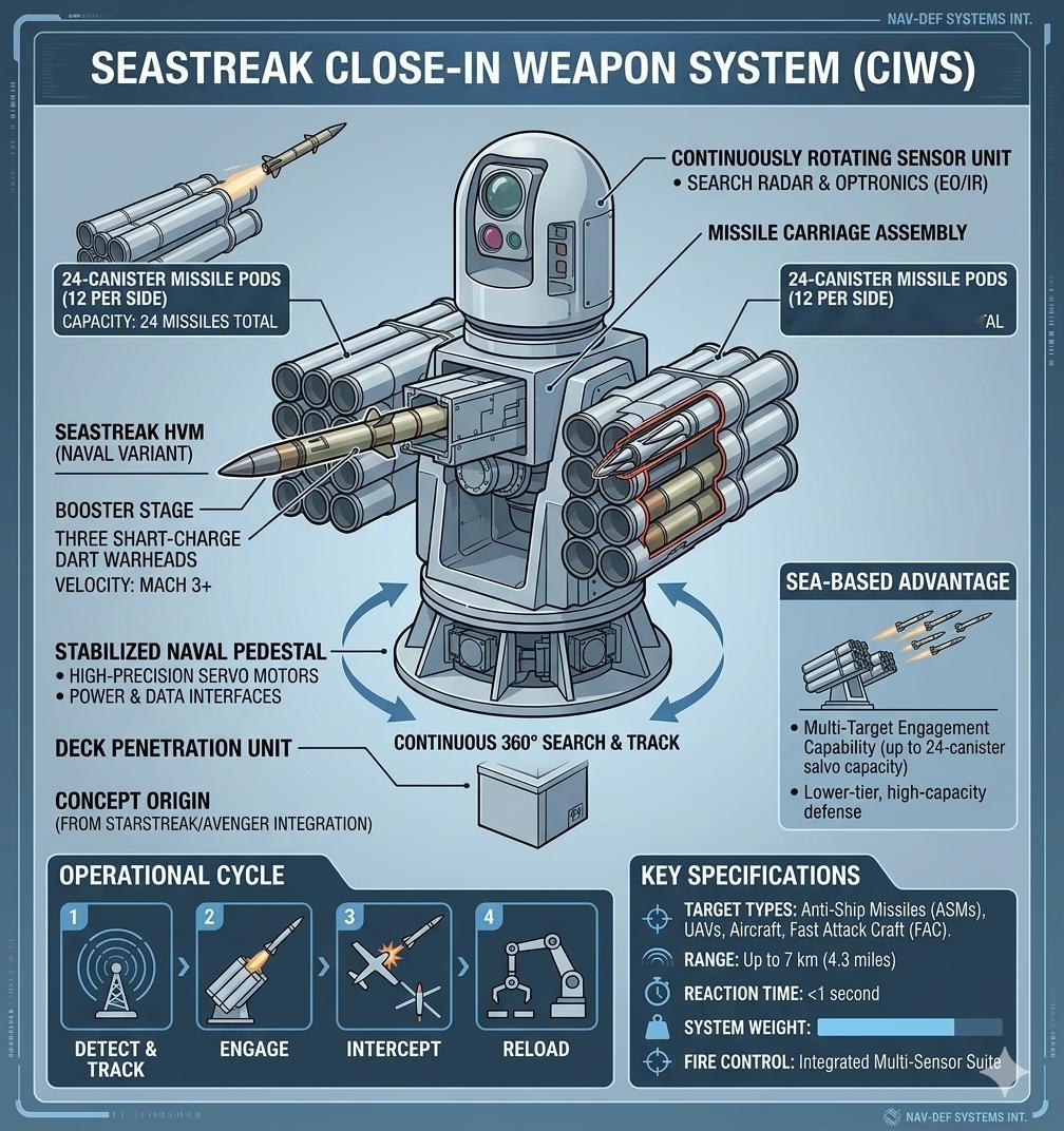 军事ai新视野 中外舰闻 “SeaStreak”近程防御武器系统(CIWS),英国🇬🇧皇家海军设想中的水面舰艇的最后一道防线,计划装备Type 42导弹驱逐舰的换代舰,但随着冷战结束,最终停留在PPT上。