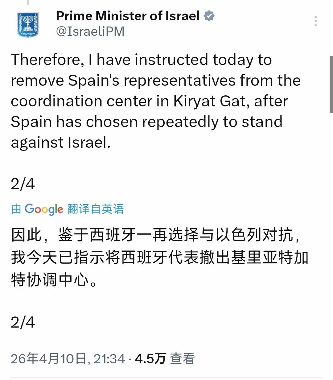 内塔尼亚胡急了!面对西班牙的批评,可谓暴跳如雷,撤人员,直接拉黑“朋友圈”。