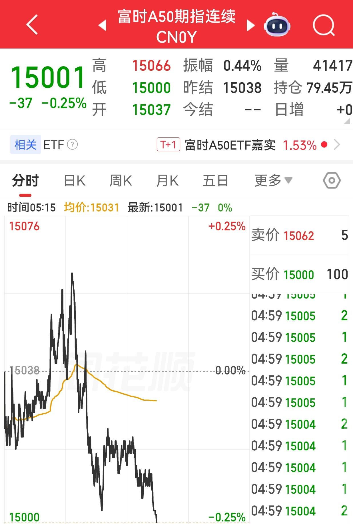 富时中国A50指数期货夜盘收跌0.25%,报15001点。
