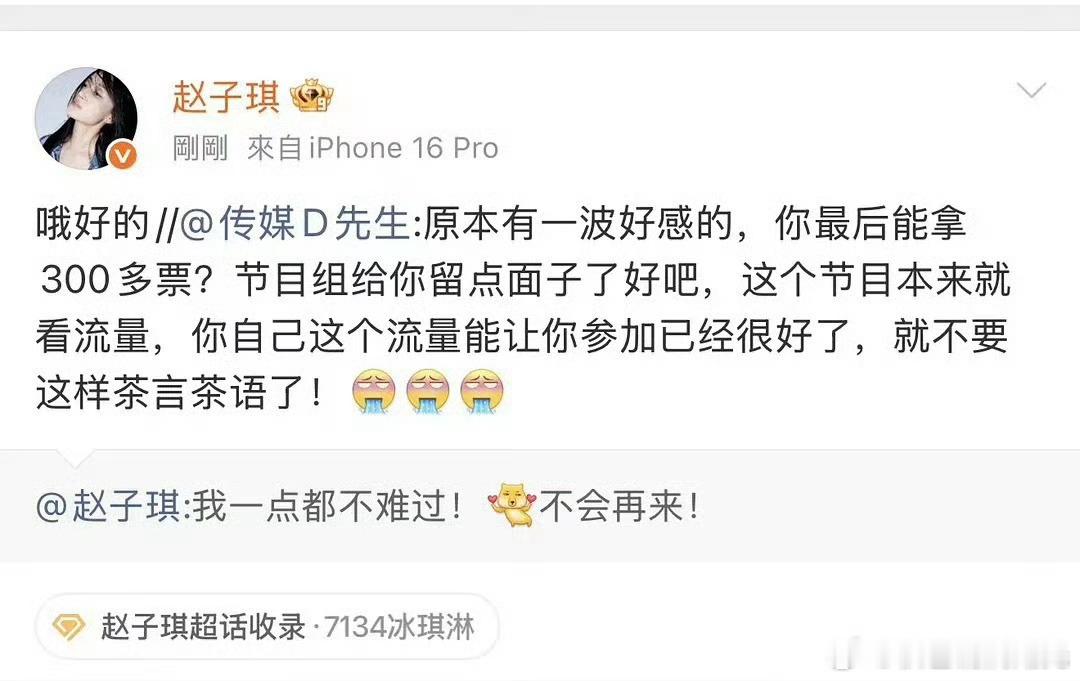 赵子琪凌晨放话:“不难过!不会再来!”4月11日凌晨,赵子琪一条微博直接炸了