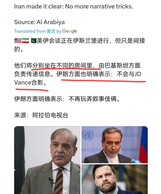 伊朗这招是真绝,这是一点都不给美国操作的机会!4月10日,根据外媒报道,外媒称,美国与伊朗在伊斯兰堡举行会谈,但谈判仅为间接谈判,因为双方将分处不同房间,由巴方人员往返传递信息,伊朗方面还明确表示:拒绝与万斯同框合影,伊朗强调:不接受任何舆论操弄把戏。