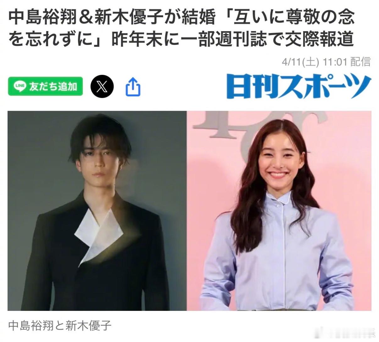 中岛裕翔新木优子今日官宣结婚!2017年,两位在电影《我们的明天在等着》中首次合作饰演恋人,之后在2018年日剧《SUITS/金装律师》以及2020年的《SUITS/金装律师2》中再度共演。2025年年底恋情曝光。