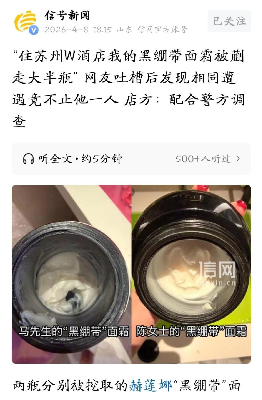 🌙江苏苏州,男子花一千多入住某高档酒店,谁知晚上回来洗漱时,发现自己5104元买的黑绷带面霜少了一大半,从痕迹来看,明显是被人用手指挖走了。男子很生气,找到酒店讨要说法,谁知酒店表示,第一次遇到这种情况,建议他报警。男子怒了,直接曝光到网上,谁知,一位女士跟他同一天在这家酒店有同样的遭遇。对此,酒店的回应让两人气愤不已。