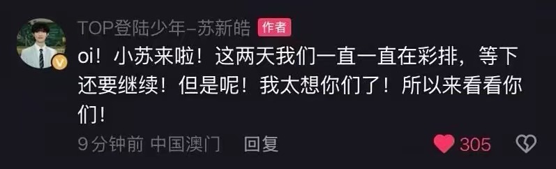 苏新皓 想快进到明天 苏新皓在评论区和粉丝说想要快进到演唱会开始,快点见到大家,