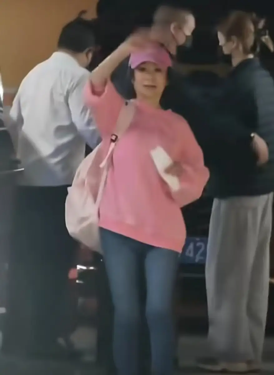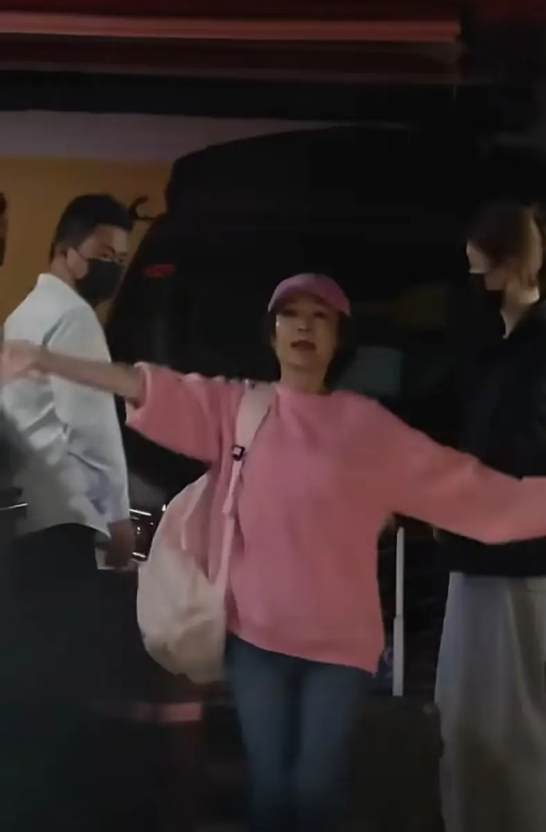 潘迎紫穿粉卫衣挥手蹦跳