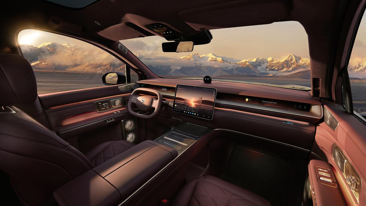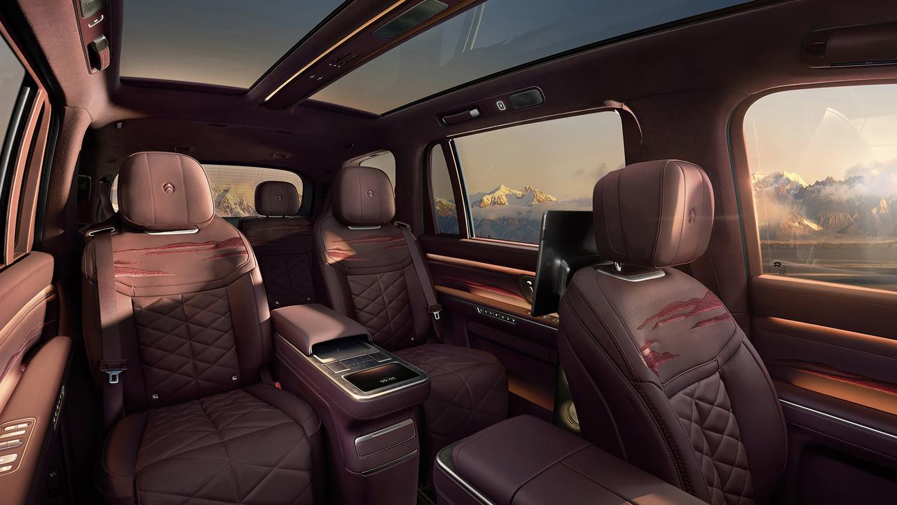 设计层面,ES9的中式美学理念也是很值得玩味的。像车漆,灵感来自昆仑山景色(地平线特别版);像座椅纹理,用的是苏绣工艺;再像音响氛围灯,融入了水波涟漪的设计语言;还有1.5米宽的“天空岛”设计,理念来自中国传统建筑的中轴对称。