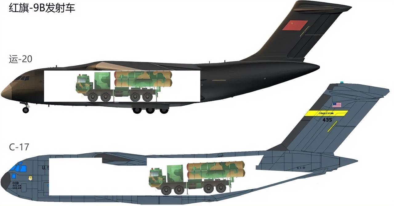这是中国运-20和美国C-17战略运输机同比例的装载能力对比图,对红旗-9B防空