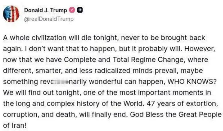 特朗普在“真实社交”公开发出灭绝威胁,扬言要“消灭整个文明以及伊朗”,哪怕几小时后收回言论,也炸翻美国政坛。