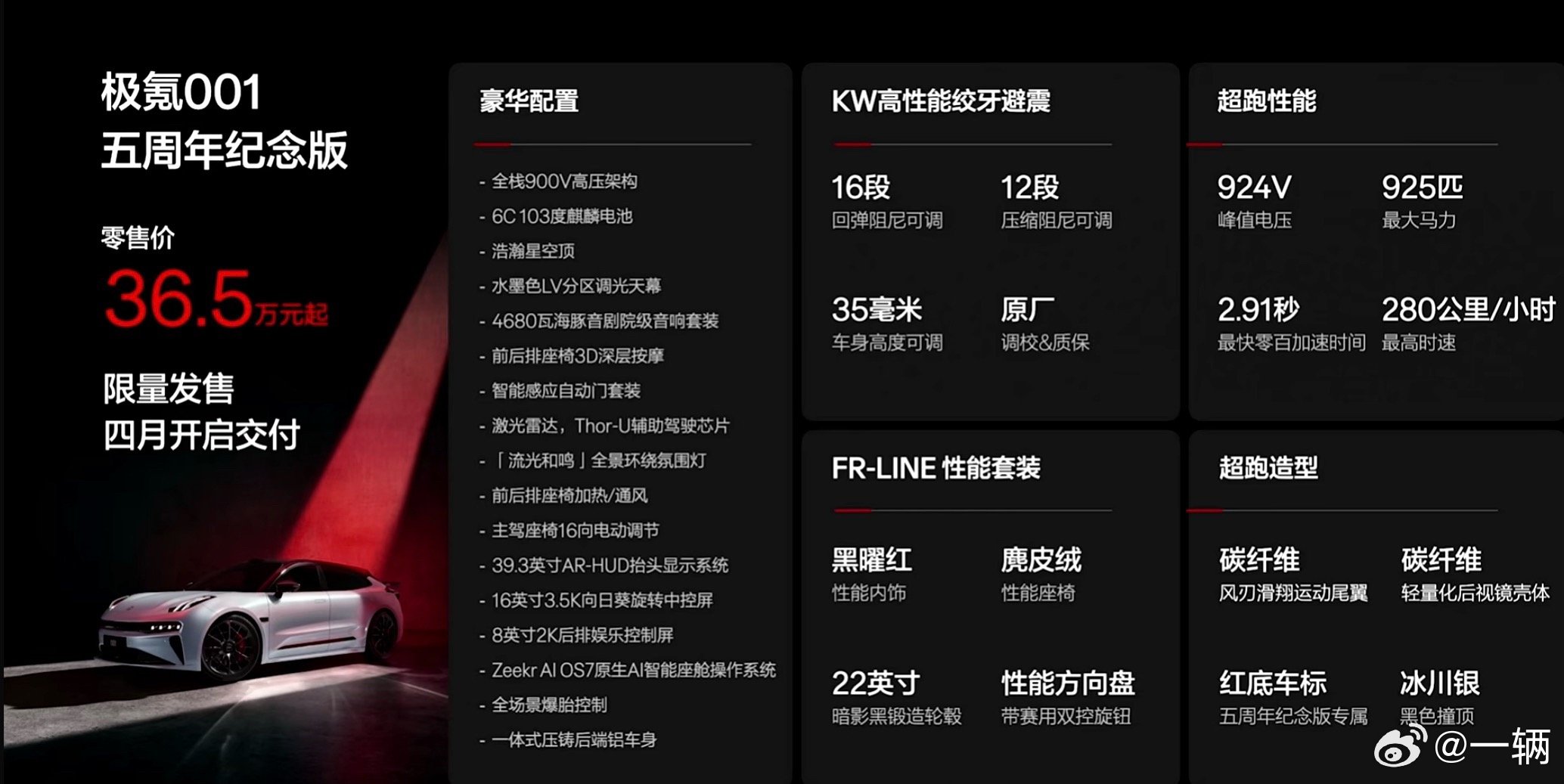 极氪001五周年纪念版36.5万你以为这只是普通001年款加配置?这可是半辆001FR特价版!街车配KW绞牙,925匹马力FR-Line性能套装,碳纤维覆盖…这辆特价001FR如何?