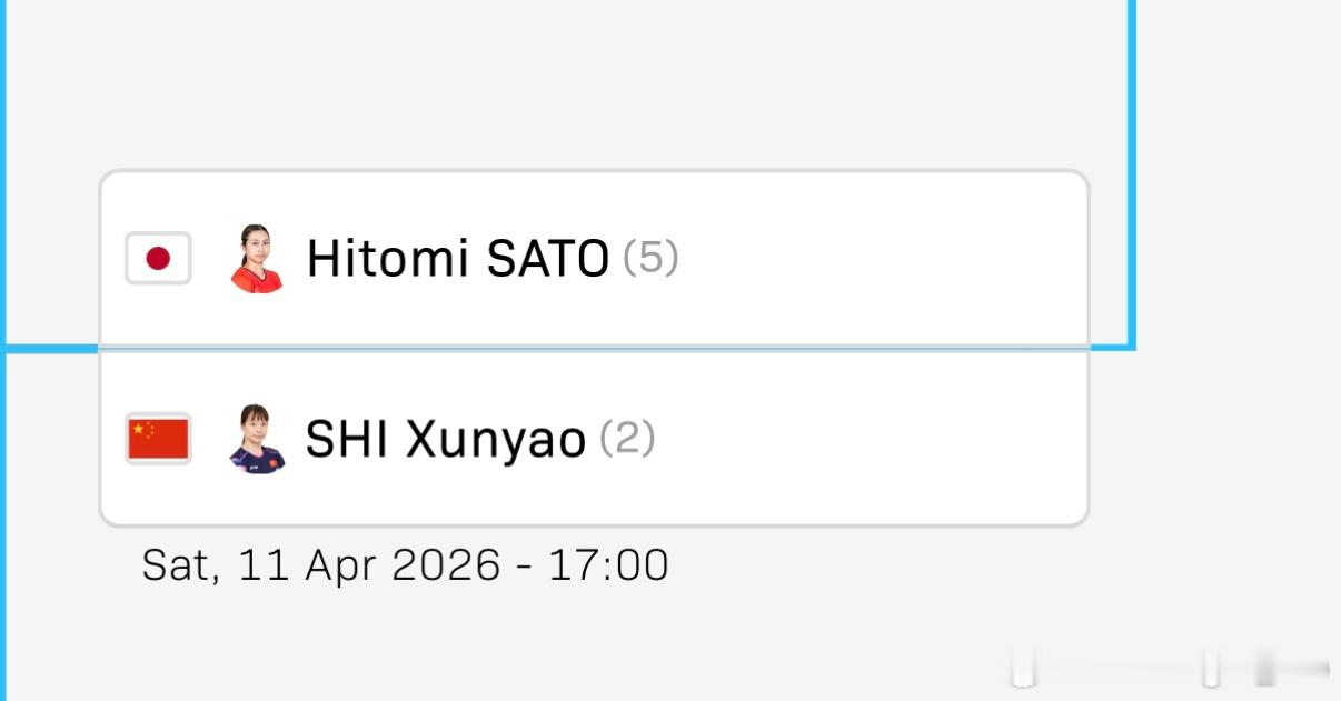 女单半决赛:17:00 🇨🇳石洵瑶🆚佐藤瞳🇯🇵我8:10 🇯🇵大藤沙月🆚桥本帆乃香🇯🇵