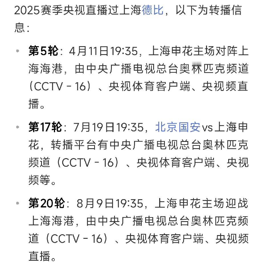 3,查了一下资料,2025赛季两场上海德比央视都直播了,但都是央视16,见图二。