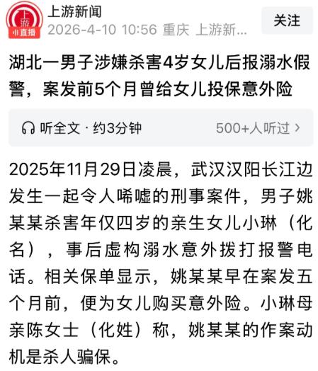 说白了,这根本不是什么意外溺水,这是一场精心策划、连畜生都干不出来的杀亲骗保案,一个亲生父亲,把4岁女儿当成换取保费的筹码,在武汉的江边,亲手终结了孩子的一生,这种恶,连地狱都容不下!
