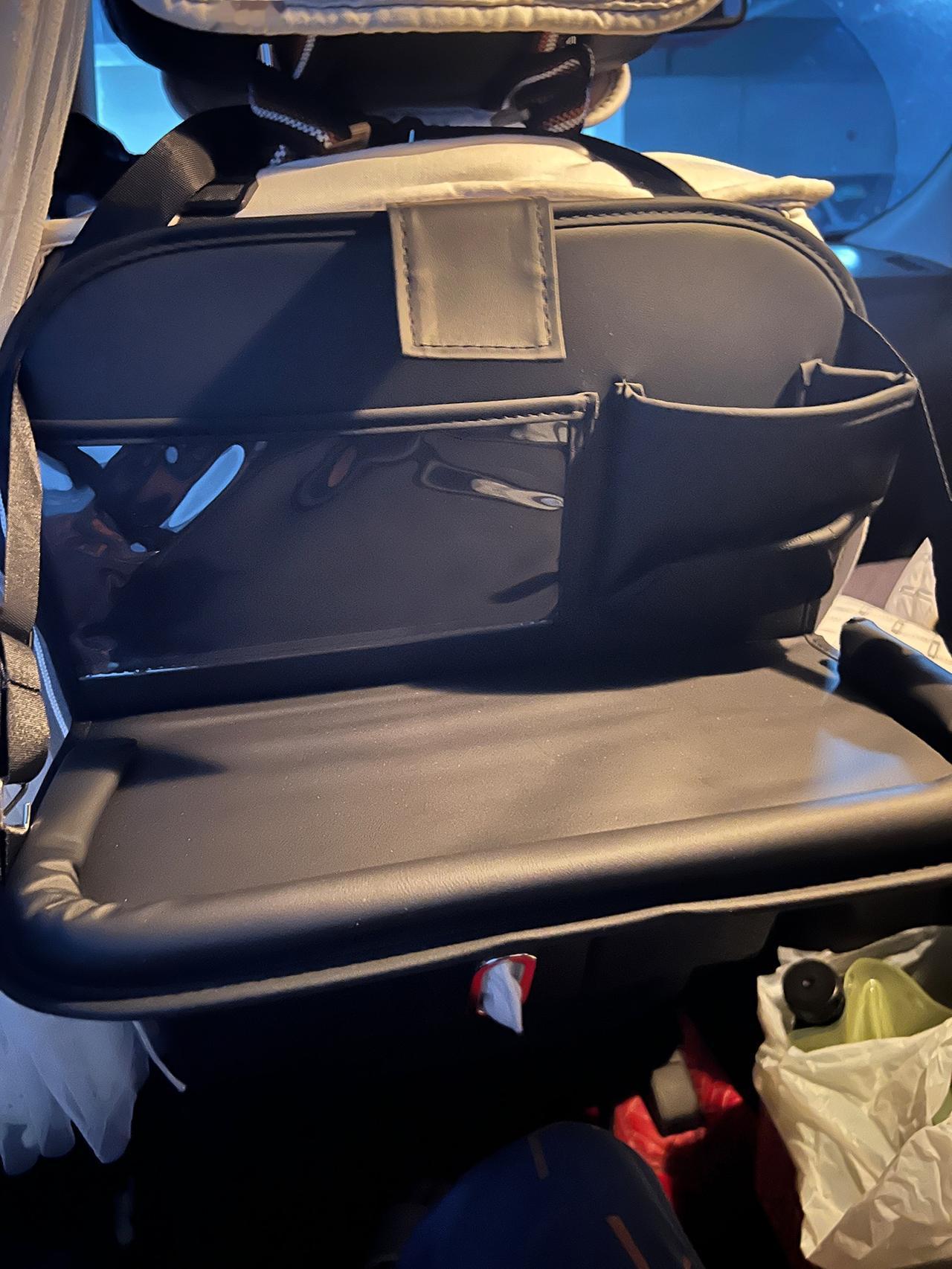 第二个是座椅背挂式置物袋,家里有娃的都懂——后排地上永远是零食包装、湿巾、小玩具。我买的是带透明视窗那款,纸巾、绘本、水杯各就各位,孩子自己就能拿,也不用每次急刹车听到东西滚来滚去。