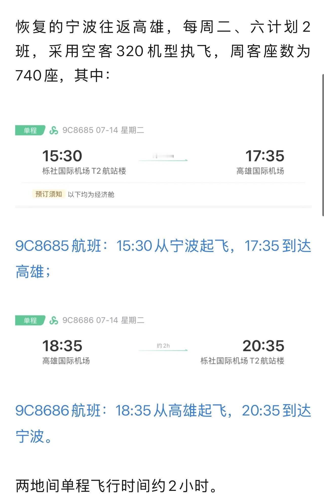 宁波直飞中国台湾高雄航线7月4日起恢复 ,两地间单程飞行时间约2小时。宁波直飞中国台湾高雄航线,7月4日起恢复!春秋航空宣布,将从7月4日,恢复宁波往返中国台湾高雄直飞航线,同时,该航司还将从6月19日起,恢复宁波往返张家界航线。为宁波旅客暑期出行,两岸人员往来与交流,提供更加丰富便利的新选择。恢复的宁波往返高雄,每周二、六计划2班,采用空客320机型执飞,周客座数为740座