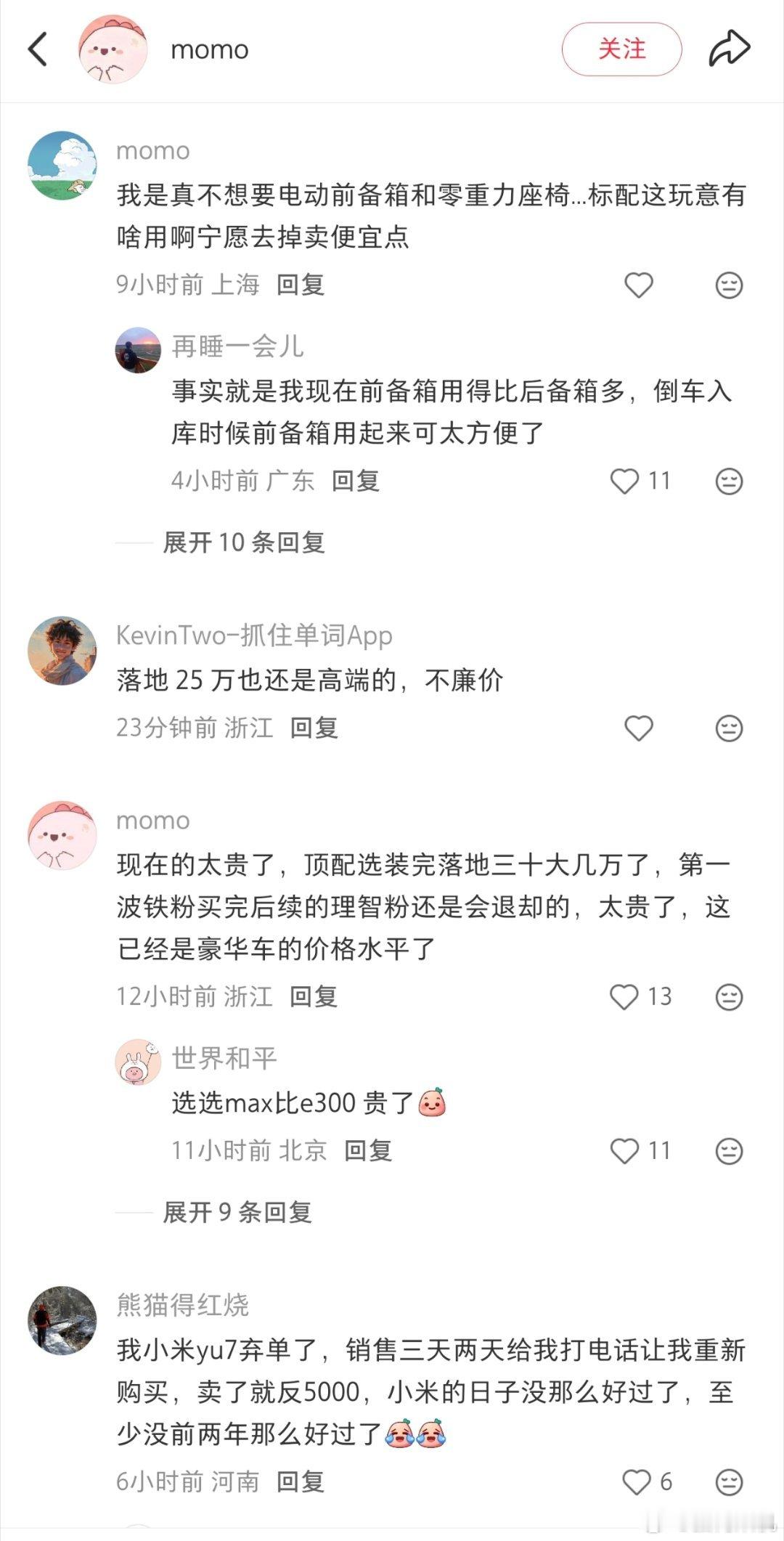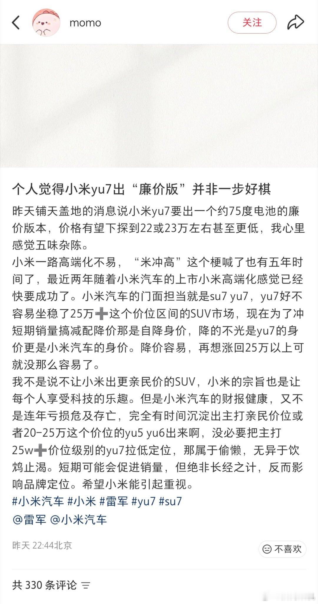 小红书有用户觉得小米yu7不应该出“平价版”,认为这样会伤害yu7的产品定位,也是对小米高端化进程开倒车。