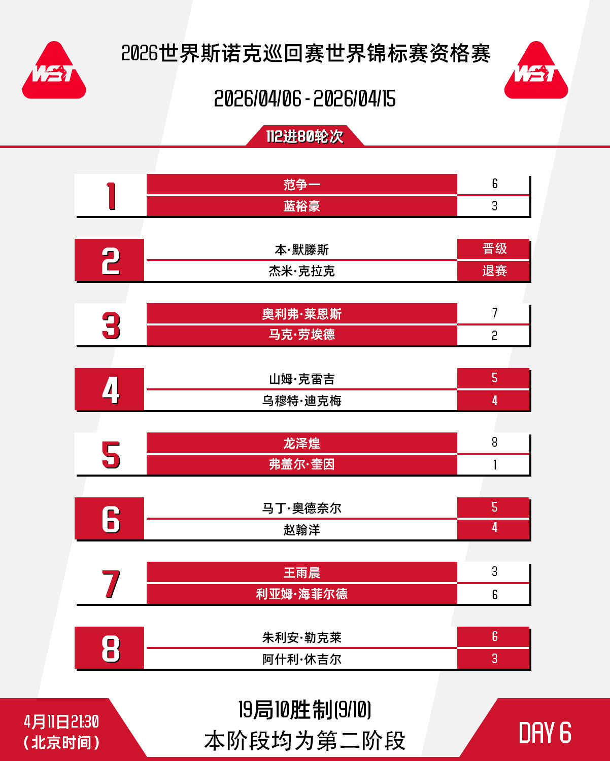 #斯诺克世锦赛4月11日赛程#