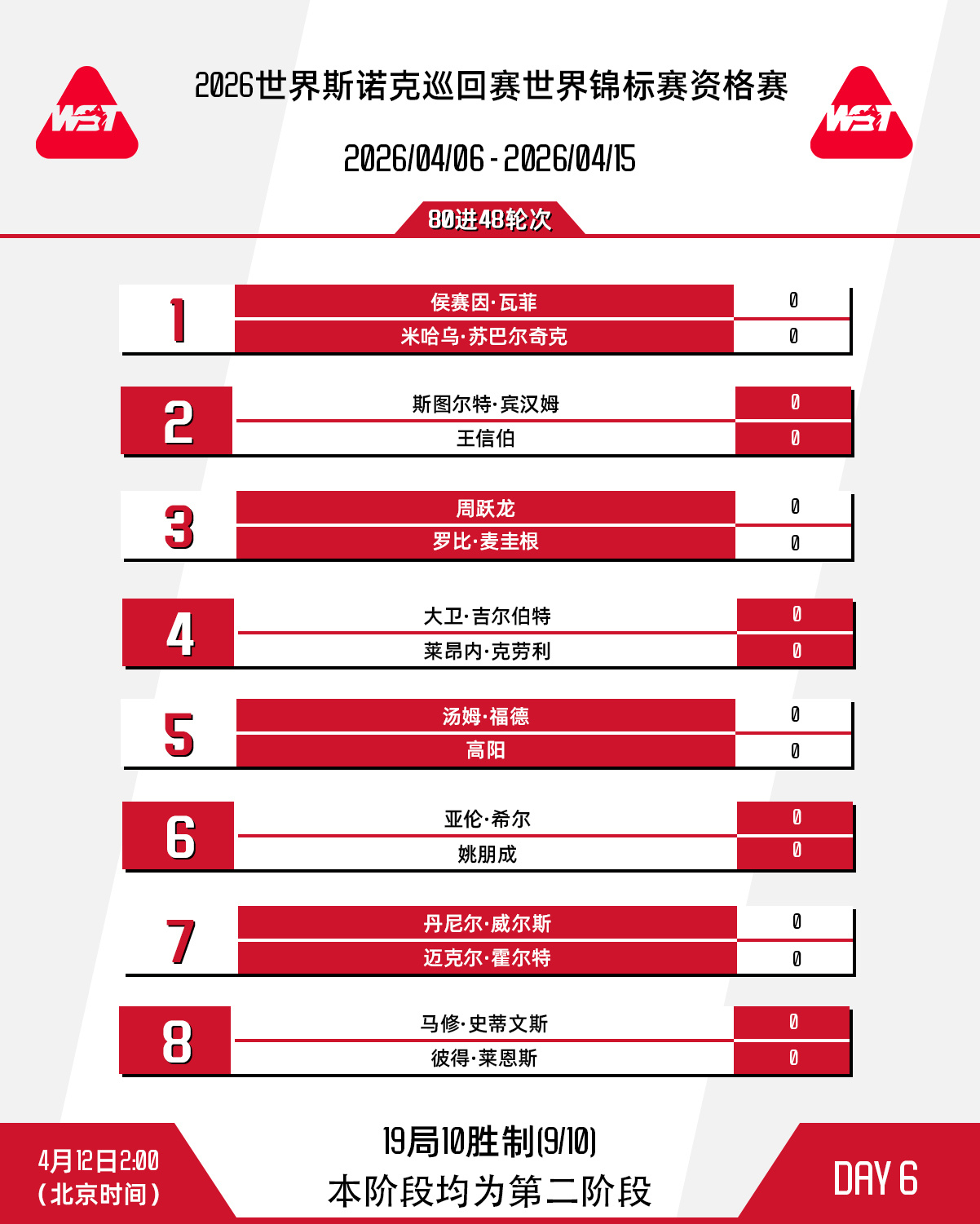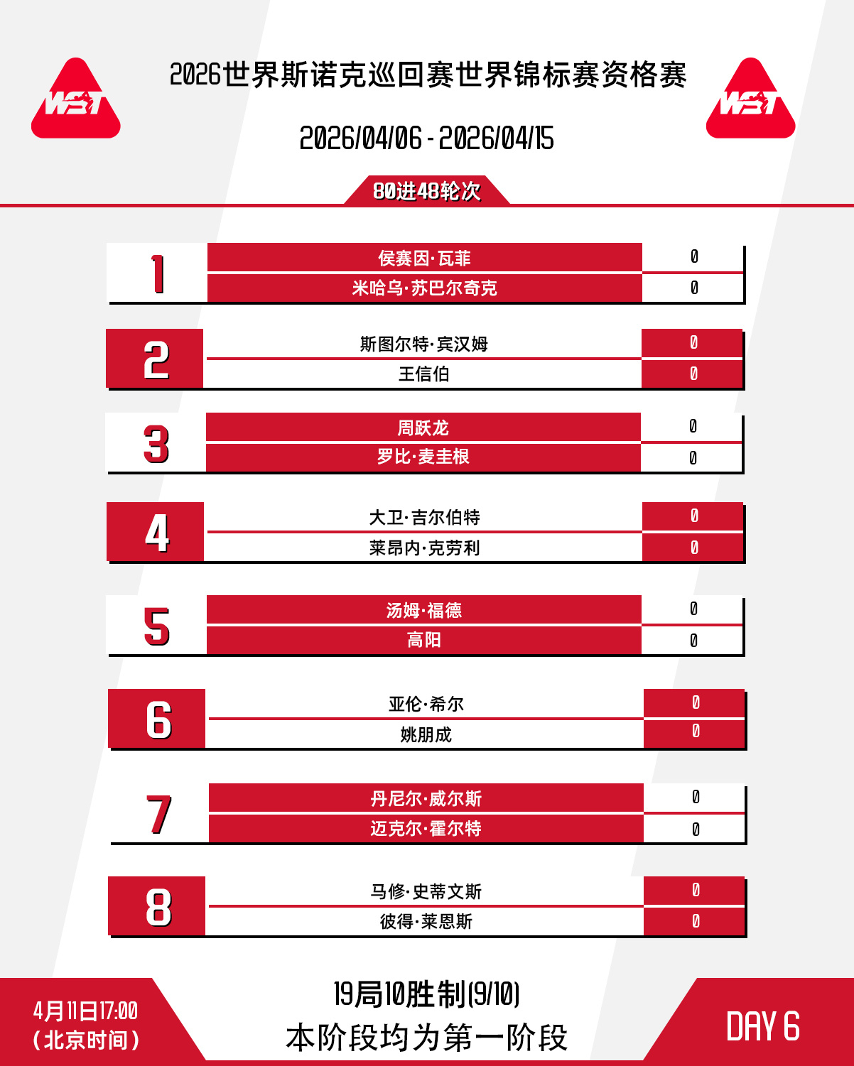 2026斯诺克世锦赛今日进入资格赛80进48轮次。17点王信伯迎战斯图尔特·宾汉姆,周跃龙、高阳、姚朋成也将在本时段出战。