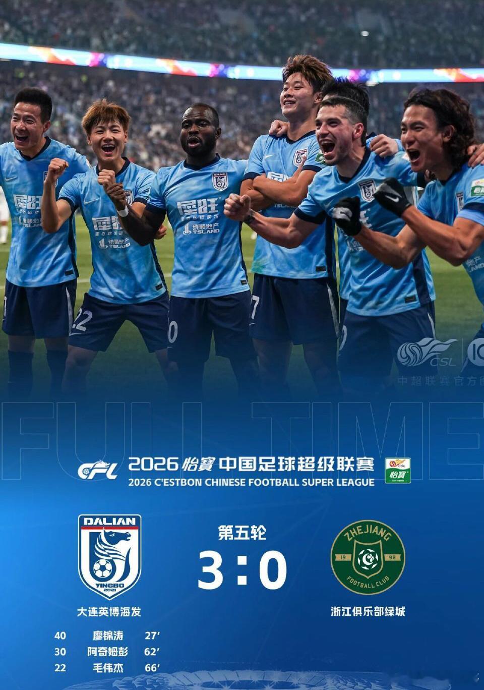 大连英博3-0横扫浙江队,已经连斩3大豪门上海海港、山东泰山、浙江队。值得一提是大连控球率仅28%,照样轻松干掉浙江,可见所谓控球率和打赢是两码事。另外小伙子毛伟杰表现相当出色,大有潜力。