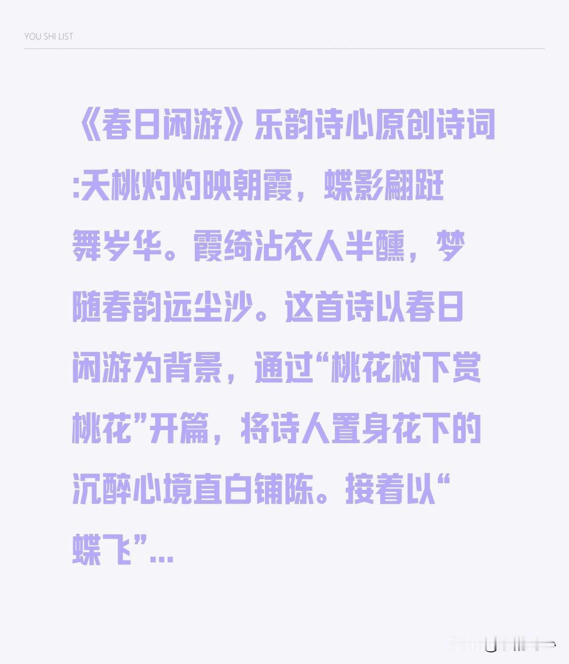 《春日闲游》乐韵诗心原创诗词: 夭桃灼灼映朝霞, 蝶影翩跹舞岁华。 霞绮沾衣人半