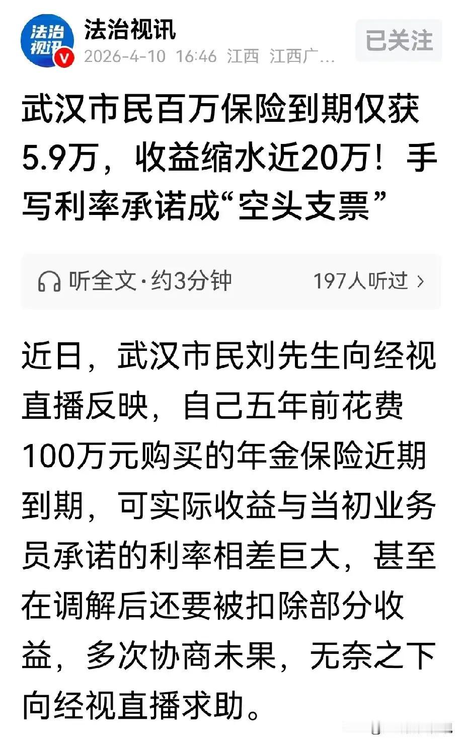 诸位朋友,今儿咱们单说一桩发生在湖北武汉的“金融惨案”。这事儿,听着像“天方夜谭”,实则是一记狠狠抽在咱们钱包上的“响亮耳光”。武汉的刘先生,五年前豪掷100万买保险,业务员那是拍着胸脯保证,年利率4.75%到5%,还白纸黑字写在了合同上。结果今年到期一算,收益只有59000多,跟说好的比,整整少了将近20万!这哪是理财?分明是“被抢钱”,100万存了5年,到手还没放余额宝多,这气受得,简直比吃了苍蝇还恶心。