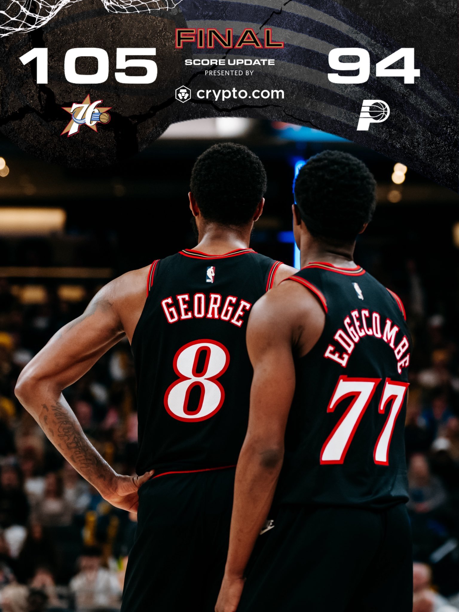 终结连败!全场比赛结束:76人队客场背靠背105-94战胜步行者!恢复正常!乔治今日上场33分钟,19投9中,三分9中3,罚球1中0,得到21分5篮板2助攻1抢断,『1失误』,正负值+7!