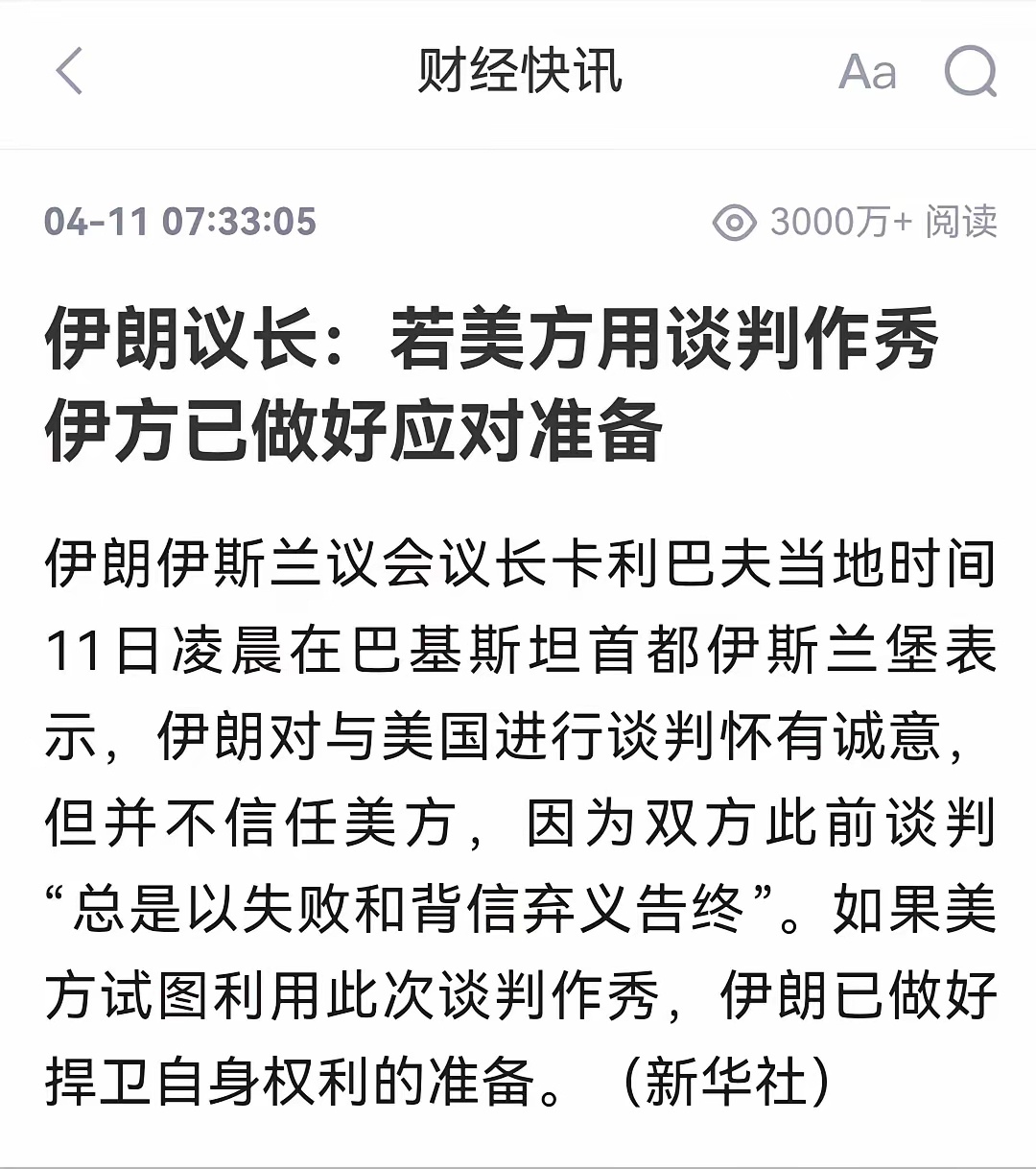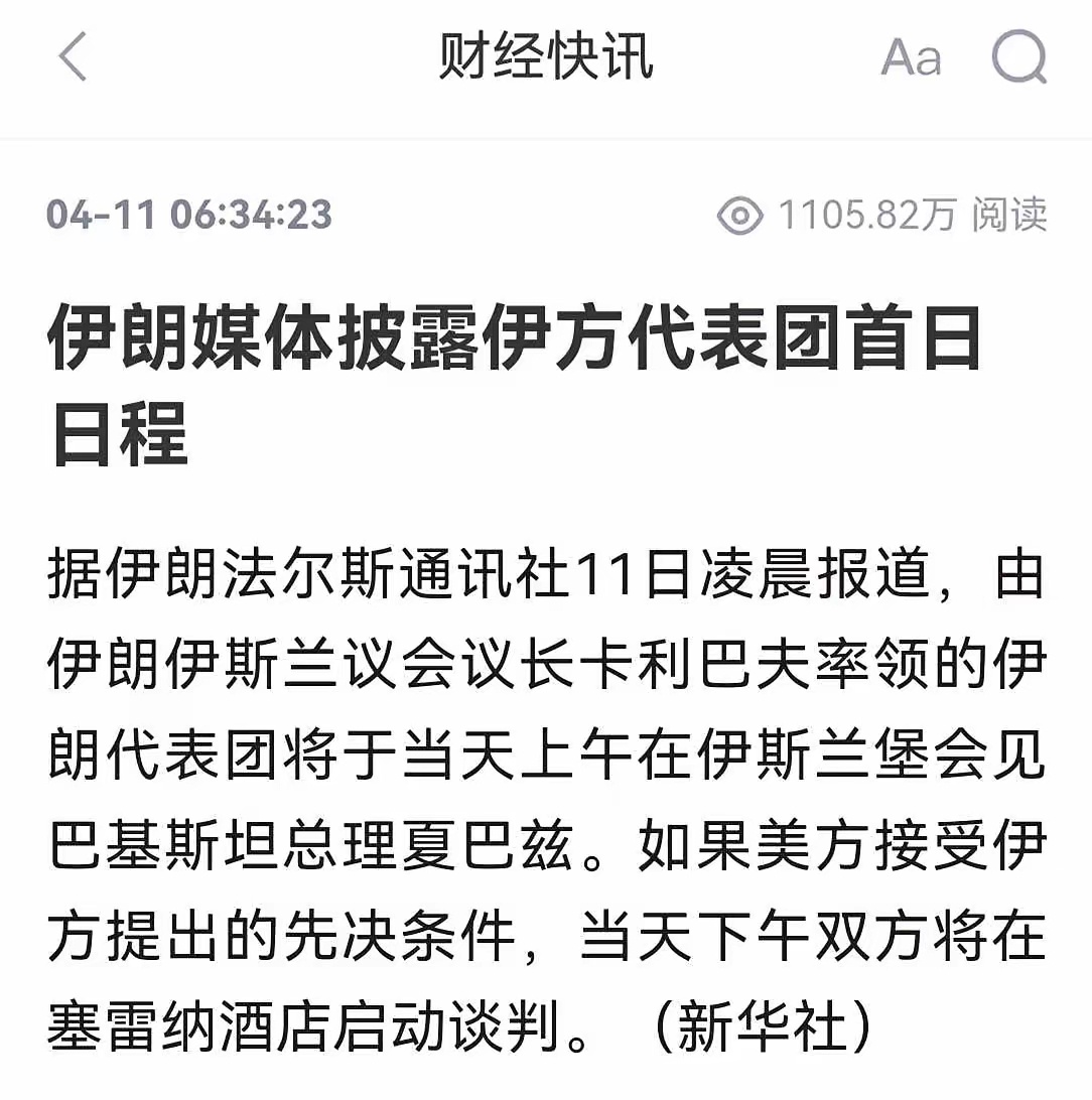 11日上午,伊代表团先会见巴基斯坦总理夏巴兹,若美方接受伊方先决条件,当天下午双方将在塞雷纳酒店启动谈判。尽管数小时前——伊美双方代表团均已抵达巴首都,但眼下仍尚未展开正式会谈。