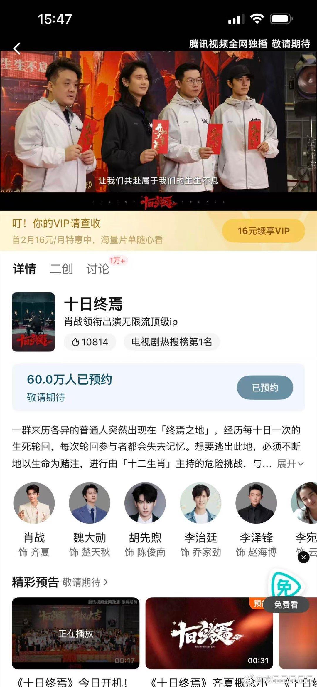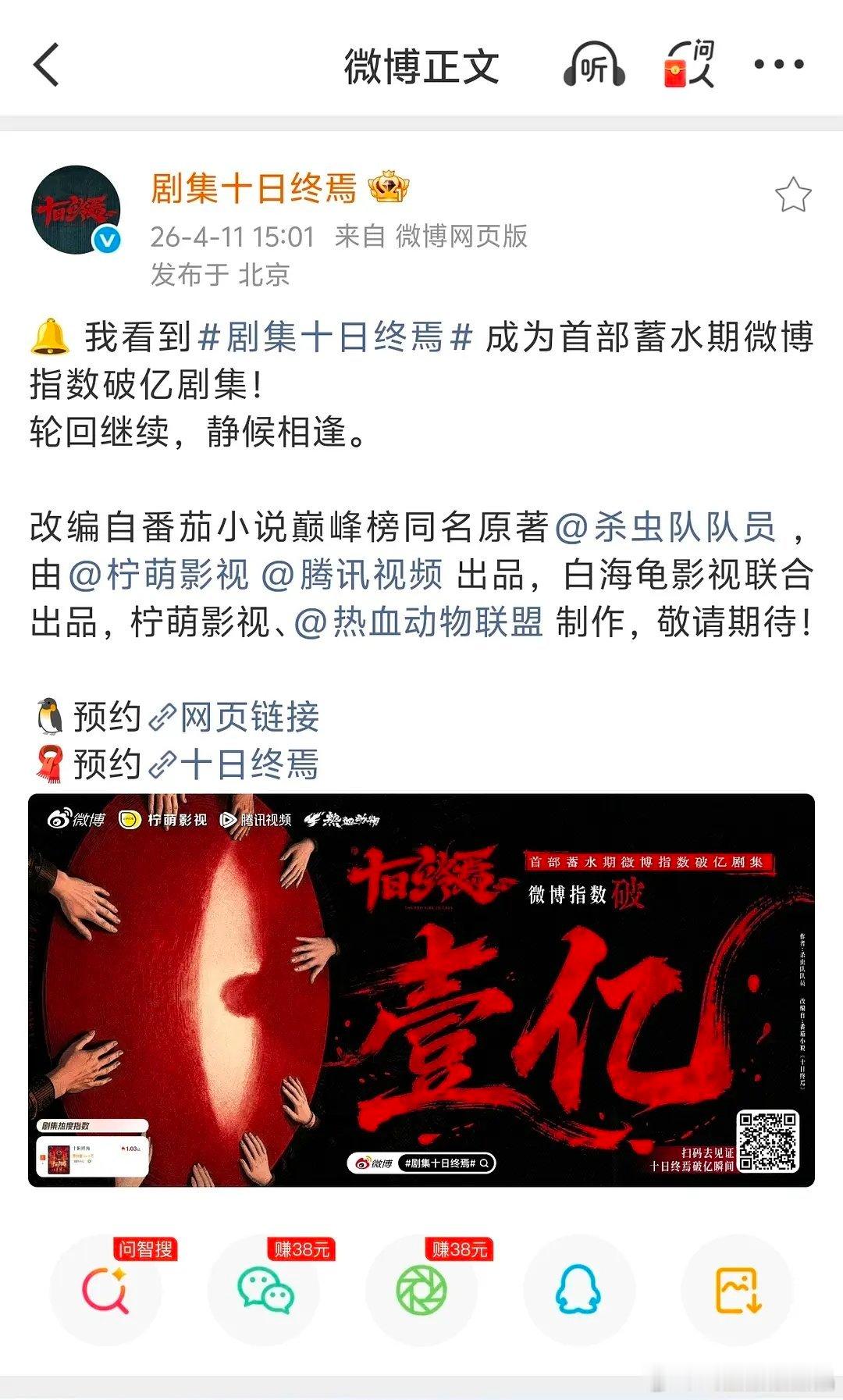 十日终焉微博指数破亿刚开拍,微博指数就破亿!平台预约已经破了60万!太牛了!