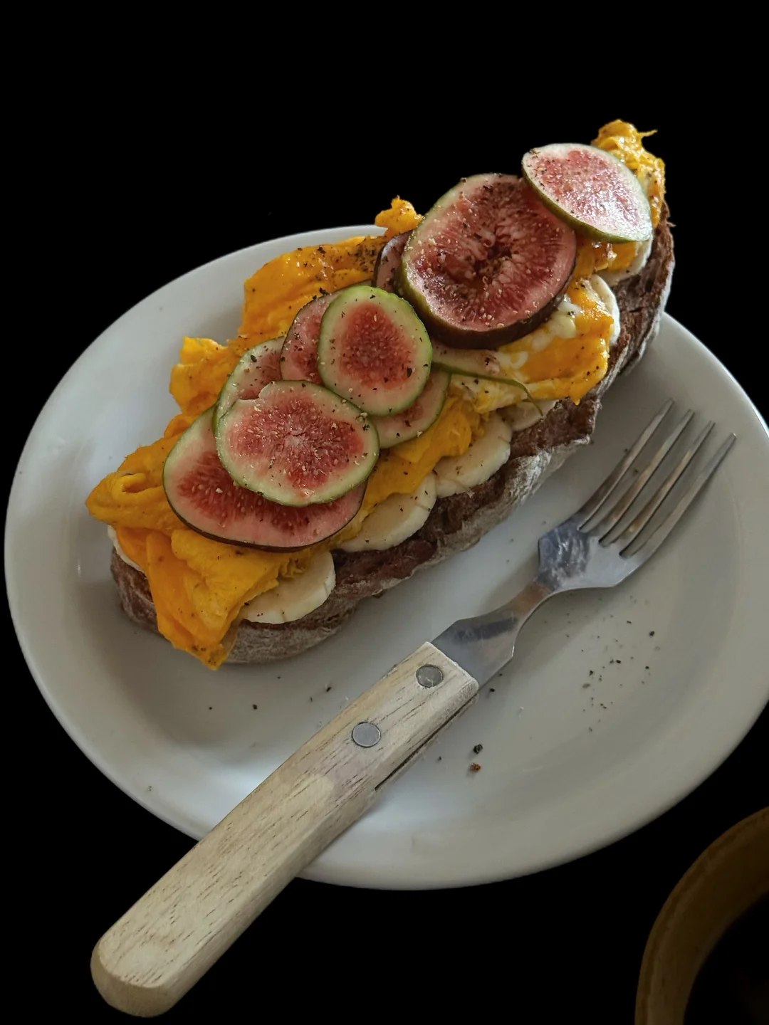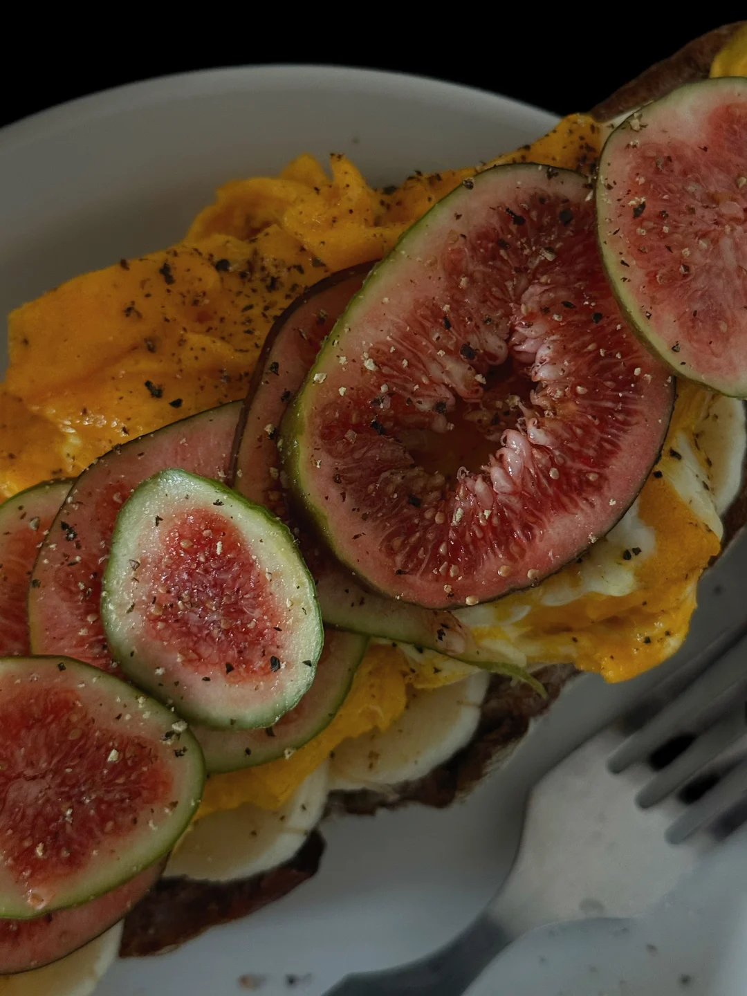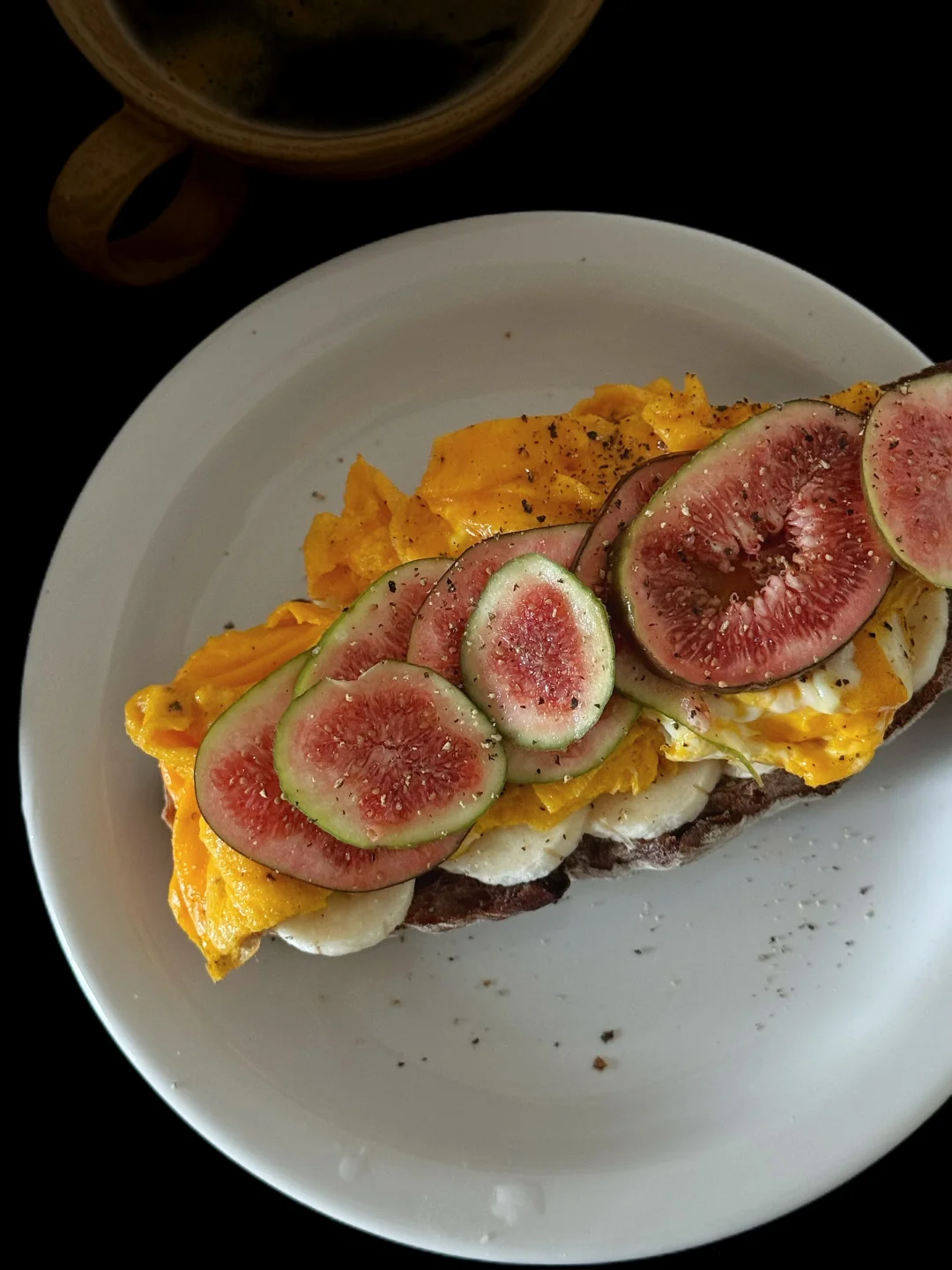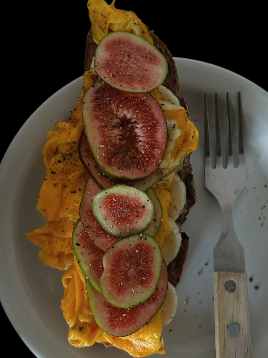 两个鸡蛋做的滑蛋 我用了5克的黄油 热量不大✌️)最后30克的无花果 撒上多多胡椒