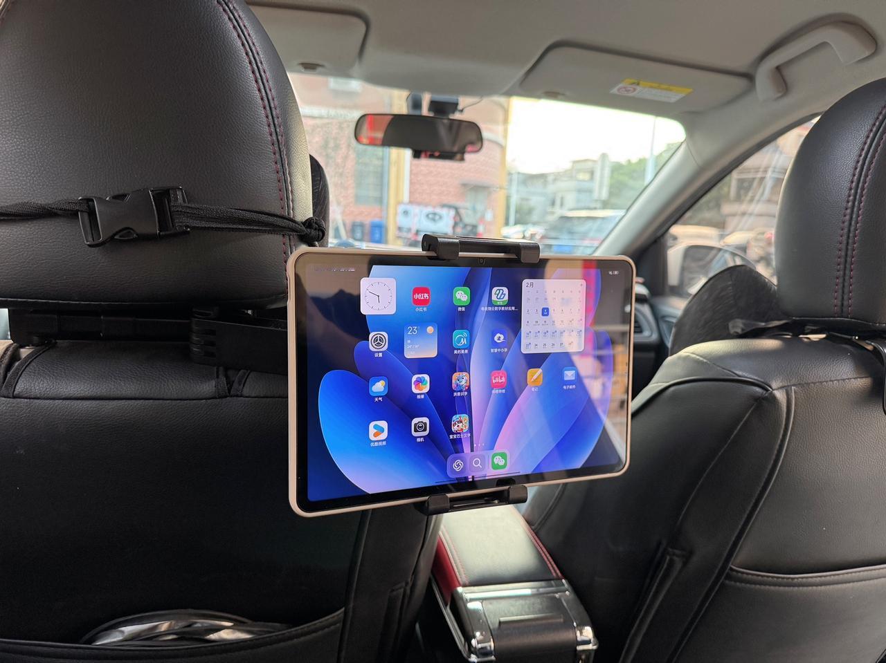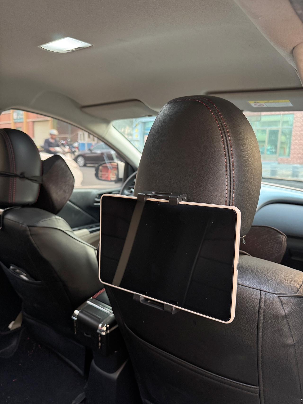 我买的这款是绑带式+360度万向球的,安装特别无脑:上面两个挂钩卡进头枕杆,下面两根绑带绕座椅背后一扣,完事。最实用的设计是万向球,iPad可以上下左右随便调角度,后排无论坐直还是葛优躺都能找到舒服的观看位置。支架中间还给充电线留了走线孔,边充边看不用绕来绕去。