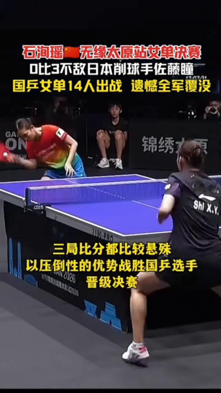 石润瑶无缘太原站女单决赛,0比3不敌日本削球手佐藤瞳,国乒女单14人出战遗憾全军覆没。石洵瑶虽全力搏杀但多次进攻被防回,三局比分都比较悬殊,以压倒性的优势战胜国乒选手晋级决赛。