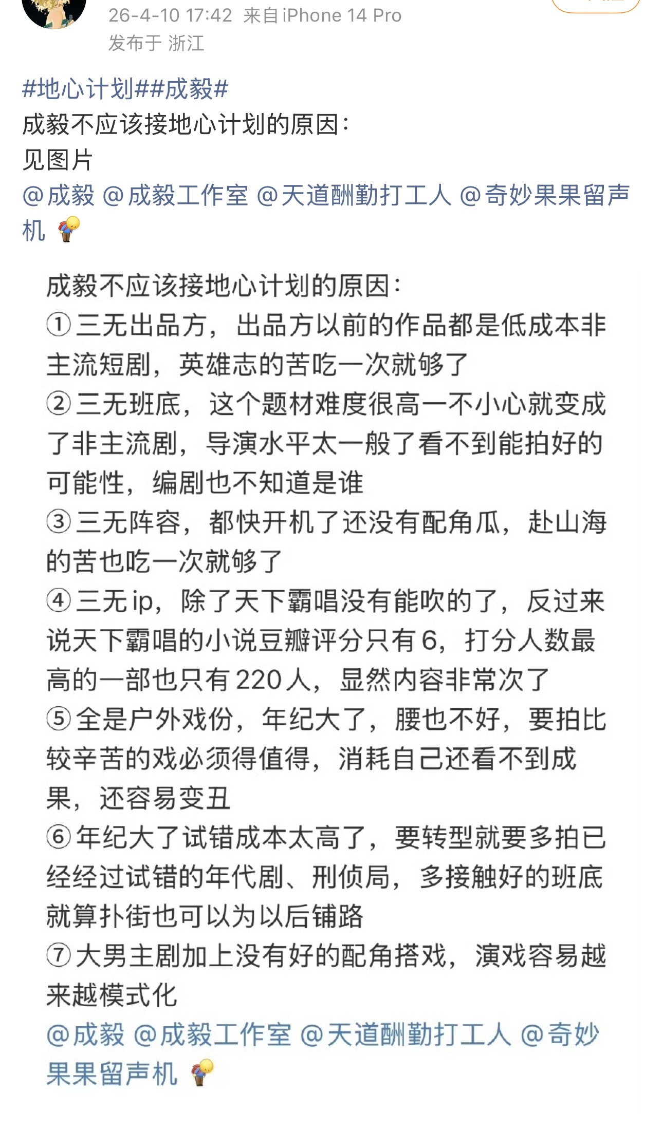 成毅粉丝在抵制网传新剧地心计划,称其三无出品方三无班底三无阵容三无ip。另一部网