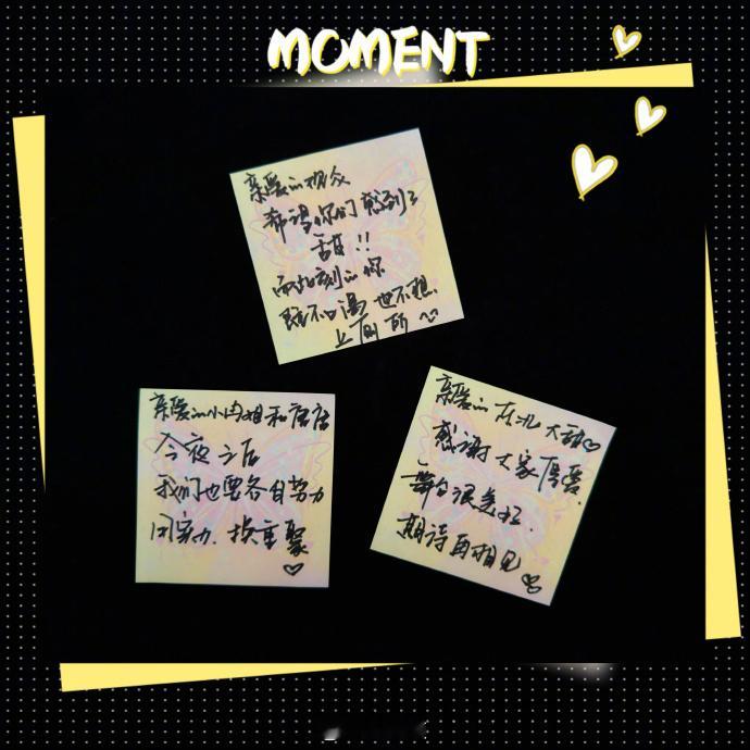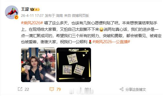 【王濛晒心愿便利贴】王濛怕自己太甜撕不下心愿便利贴 4月11日,晒照发文: 唱了这么多天,也该有几张心愿便利贴了呀。本来想表演结束贴手上,在现场给大家看,又怕自己太甜撕不下来说两句真心话,我们的进步是一点一滴汇聚成河的,希望我们三个所有的努力、突破和勇敢,都会被看见、被肯定也被爱着,谢谢大家,祝我们一公顺利