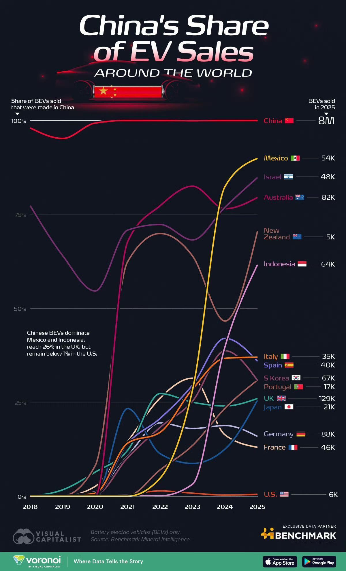 中国制造的电动汽车在全球市场有多猛?2025年,中国制造的电动汽车在世界各国电动汽车市场的份额出乎意料: