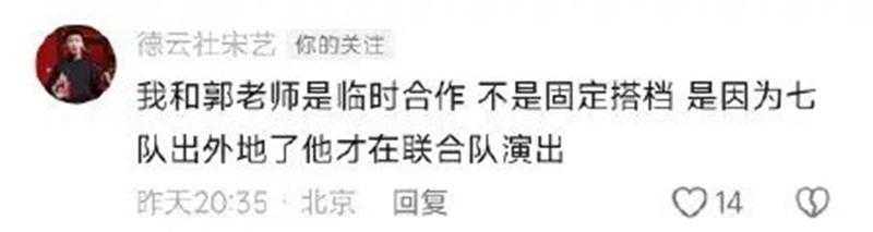 郭霄汉空降联合队给宋艺捧哏,当事人回应只是临时搭档!德云社宋艺在评论区回应了网友的猜测。对于在联合队和郭霄汉的搭档,宋艺表示,是临时的,不是固定的,因为七队出差去成都,郭霄汉才来联合队的。宋艺没回应前,网友猜测这两位要搭档。宋艺回应后,给郭霄汉找搭档,建议俩人凑合过的,也不在少数。对于相声演员来说,搭档是可遇而不可求的。对于观众来说,搭档就像介绍对象一样。一个是男的,一个是女的,年龄刚好,都没恋爱,那就能见见面。至于适合或不适合,介绍人通常是不考虑这些的。