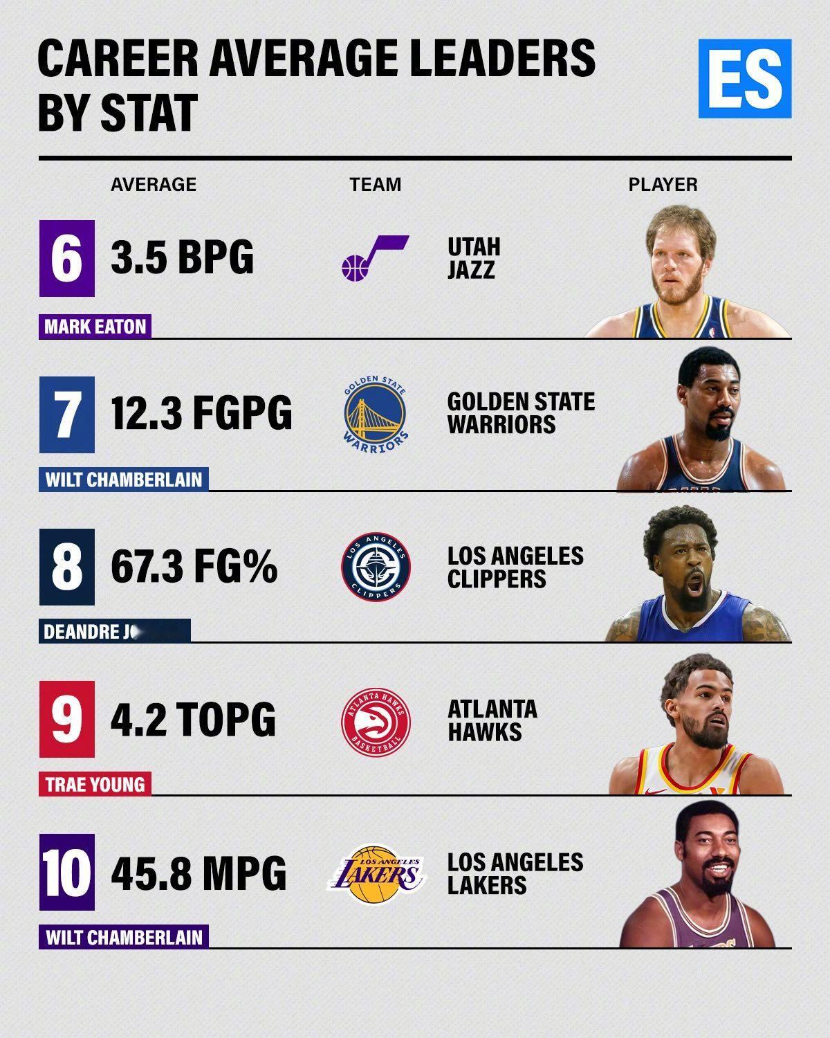 NBA各项数据历史领跑者,乔丹30.123分场均得分相信大多数人都知道,而助攻最高的是魔术师11.19次,篮板是张伯伦夸张的22.89个。还有抢断、盖帽、三分场均命中数、投篮命中率等等。
