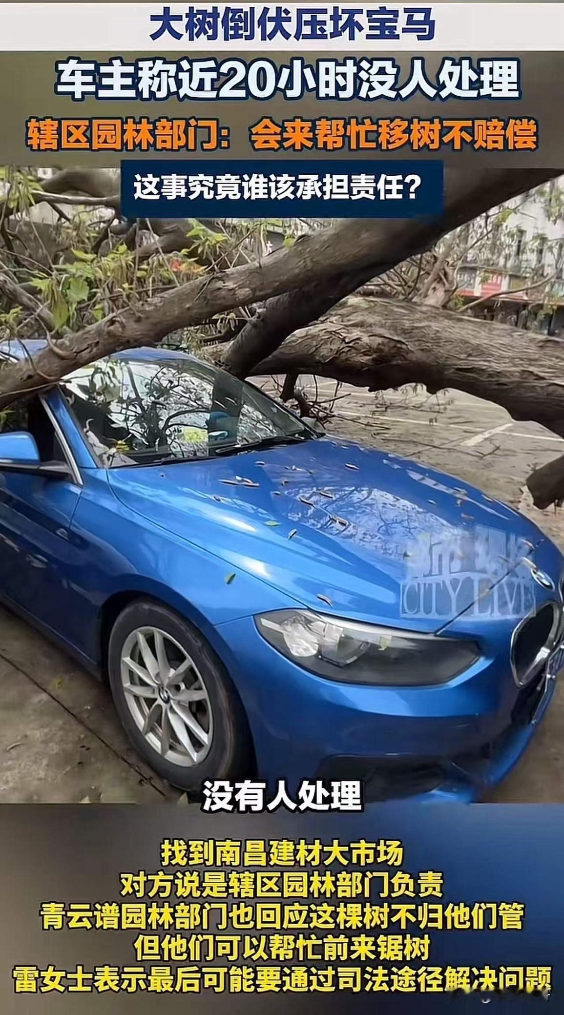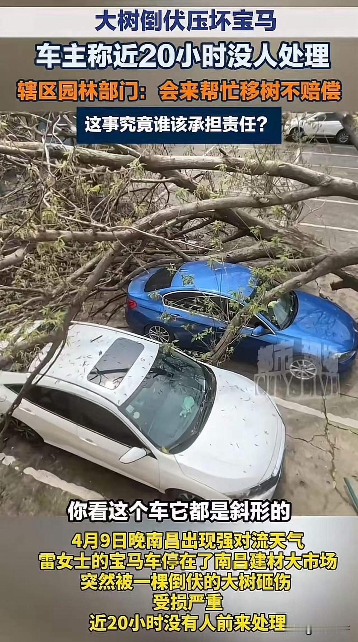 江西南昌,宝马车被倒下大树压坏,近20小时无人处理!市场管理方推给园林部门,园林部门表示不赔偿,车主崩溃:到底谁来负责?