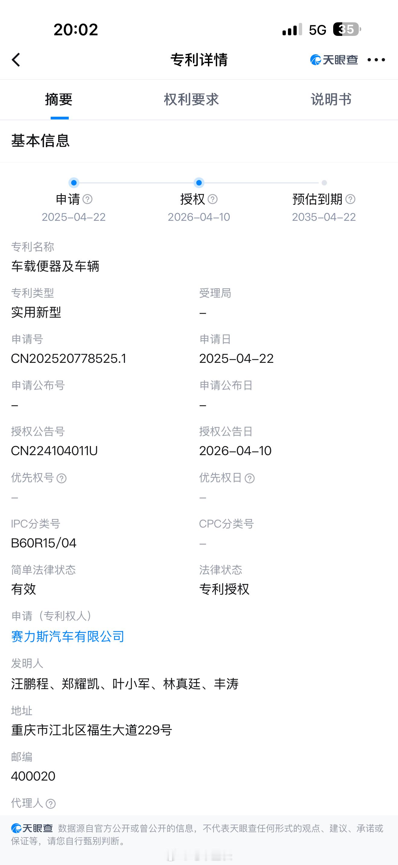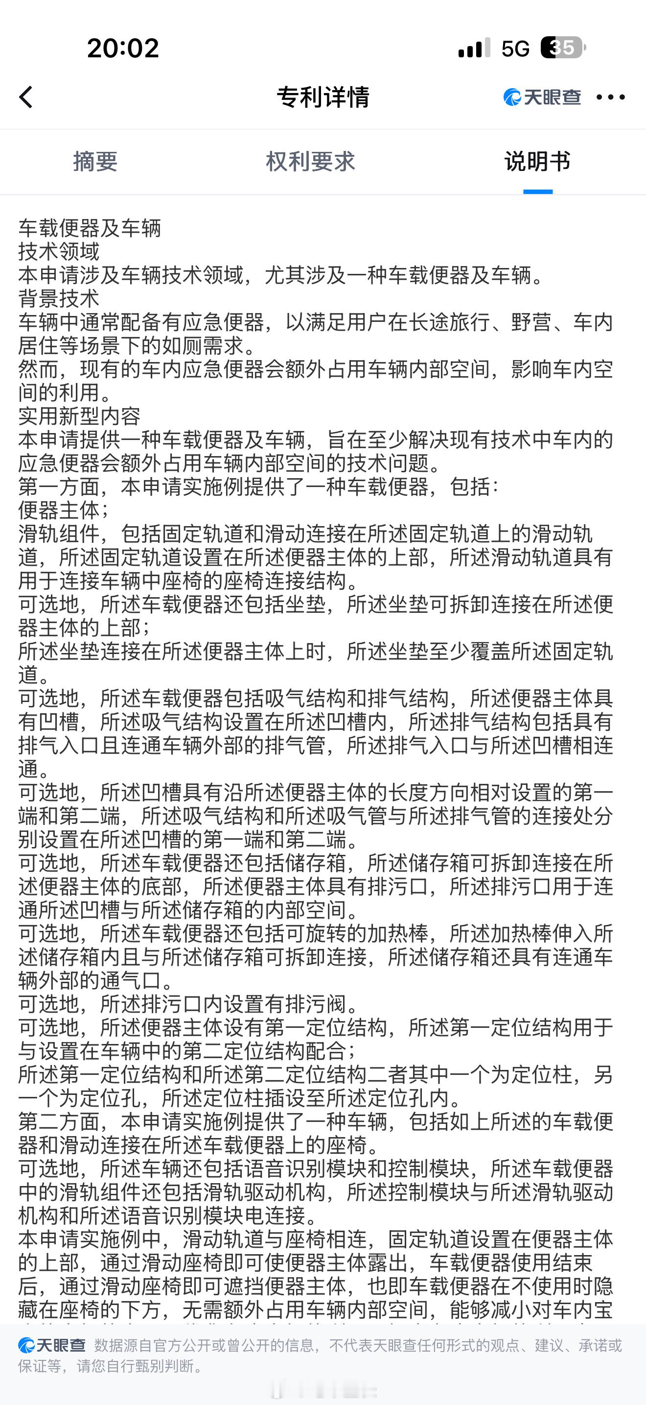 赛力斯车载便器是真的,目前已获得专利授权主要面对有长途出行、野营、车内居住需求的用户由于经常做续航测试和自驾游,我个人非常需要有排污、有智能语音控制、有电动控制模块有吸气和排气模块,放心不会臭运用时间和运用车型未知多说一句,赛力斯申请获批的专利有8046件了,其中• 实用新型:约 67.8%• 发明专利:约 23.3%• 外观设计:约 8.9%