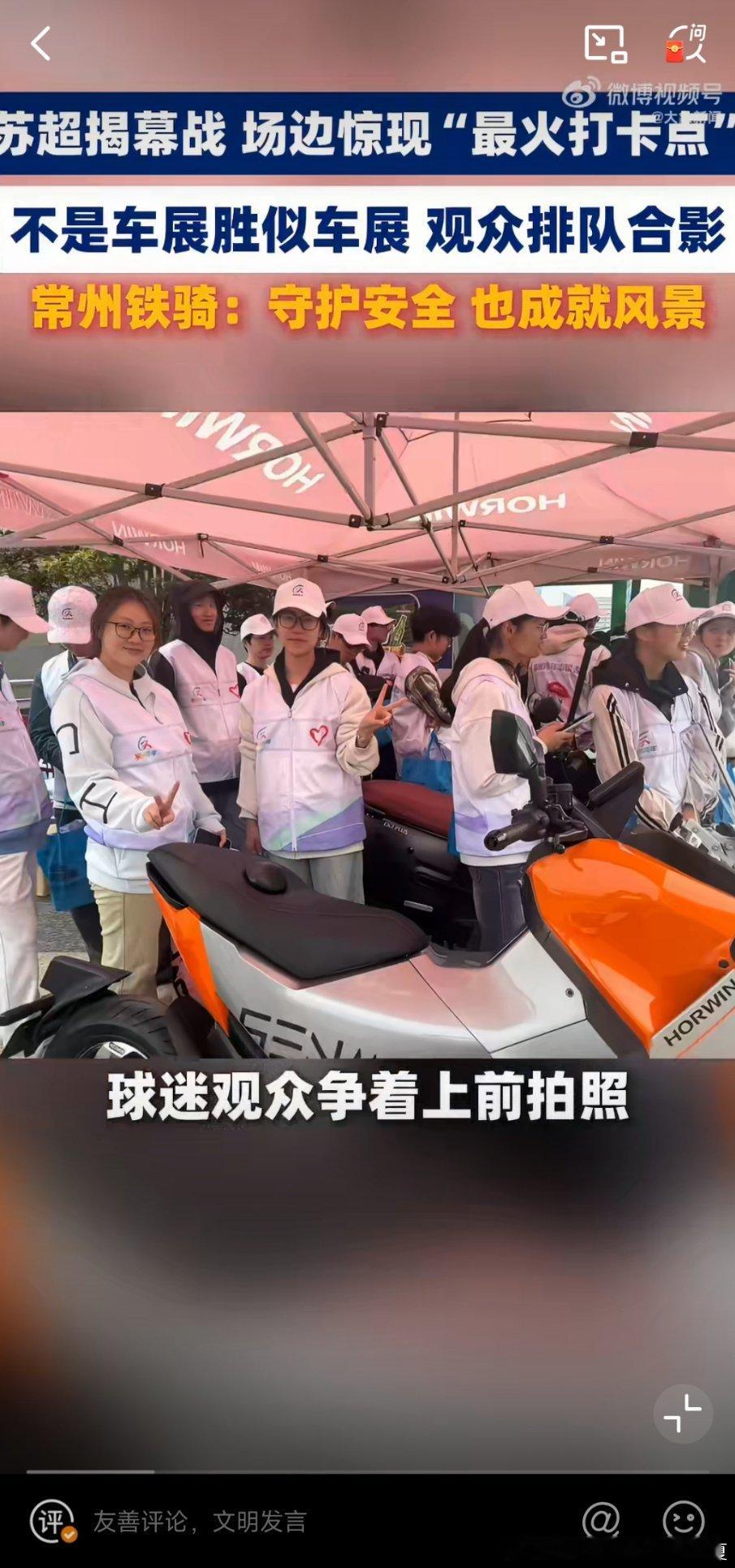 苏超开幕式常州铁骑成打卡点 苏超开幕式现场人气爆棚,常州铁骑骑着电摩穿梭值守维持