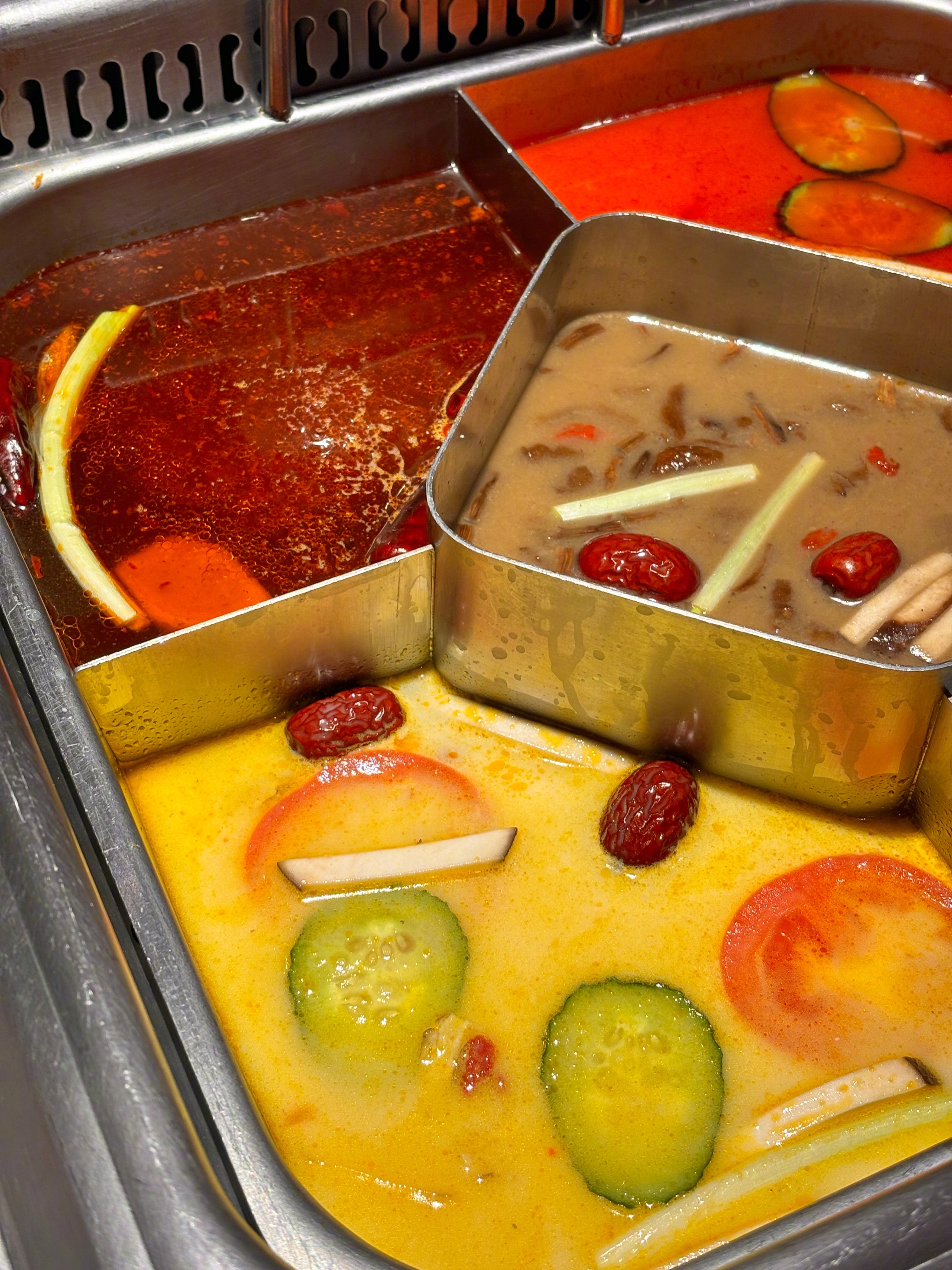 喜欢这种四公开的火锅。忙了一整天,终于被四宫格火锅治愈啦✨清汤、麻辣、番茄、菌汤四种口味,一次全满足~不管爱辣还是爱鲜,都能找到自己的那口锅,涮菜超方便。工作再累,吃到想吃的美食就很治愈,好好犒劳自己,幸福感直接拉满~