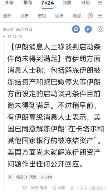 不过,就在刚刚,财经快讯称,另有伊朗方面消息人士称,包括解冻伊朗被冻结资产icon和黎巴嫩icon停火等伊朗方面设定的启动谈判条件目前尚未得到满足。